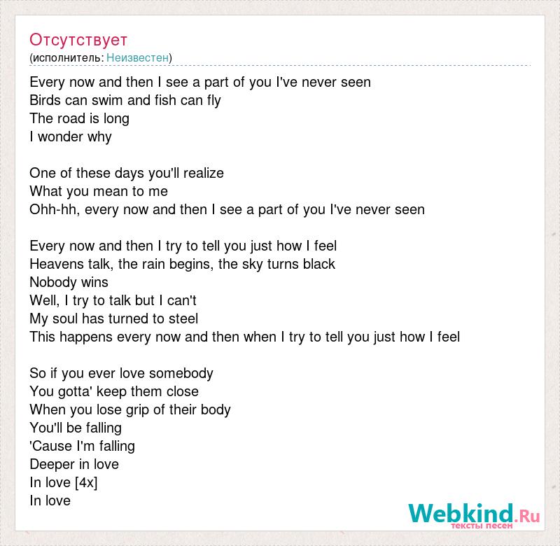 Every now and then I see a part of you I've never seen Birds can swim and fish can fly The road is long I wonder why One of these days you'll realize What you mean to me Ohh-hh, every now and then I see a part of you I've never seen Every now and then I try to tell you just how I feel Heavens talk, the rain begins, the sky turns black Nobody wins Well, I try to talk but I can't My soul has turned to steel This happens every now and then when I try to tell you just how I feel So if you ever love somebody You gotta' keep them close When you lose grip of their body You'll be falling 'Cause I'm falling Deeper in love In love [4x] In love