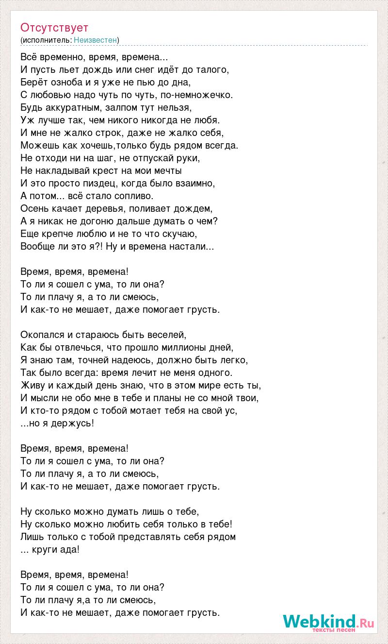 Всё временно, время, времена... И пусть льет дождь или снег идёт до талого, Берёт озноба и я уже не пью до дна, С любовью надо чуть по чуть, по-немножечко. Будь аккуратным, залпом тут нельзя, Уж лучше так, чем никого никогда не любя. И мне не жалко строк, даже не жалко себя, Можешь как хочешь,только будь рядом всегда. Не отходи ни на шаг, не отпускай руки, Не накладывай крест на мои мечты И это просто пиздец, когда было взаимно, А потом... всё стало сопливо. Осень качает деревья, поливает дождем, А я никак не догоню дальше думать о чем? Еще крепче люблю и не то что скучаю, Вообще ли это я?! Ну и времена настали... Время, время, времена! То ли я сошел с ума, то ли она? То ли плачу я, а то ли смеюсь, И как-то не мешает, даже помогает грусть. Окопался и стараюсь быть веселей, Как бы отвлечься, что прошло миллионы дней, Я знаю там, точней надеюсь, должно быть легко, Так было всегда: время лечит не меня одного. Живу и каждый день знаю, что в этом мире есть ты, И мысли не обо мне в тебе и планы не со мной твои, И кто-то рядом с тобой мотает тебя на свой ус, ...но я держусь! Время, время, времена! То ли я сошел с ума, то ли она? То ли плачу я, а то ли смеюсь, И как-то не мешает, даже помогает грусть. Ну сколько можно думать лишь о тебе, Ну сколько можно любить себя только в тебе! Лишь только с тобой представлять себя рядом ... круги ада! Время, время, времена! То ли я сошел с ума, то ли она? То ли плачу я,а то ли смеюсь, И как-то не мешает, даже помогает грусть.