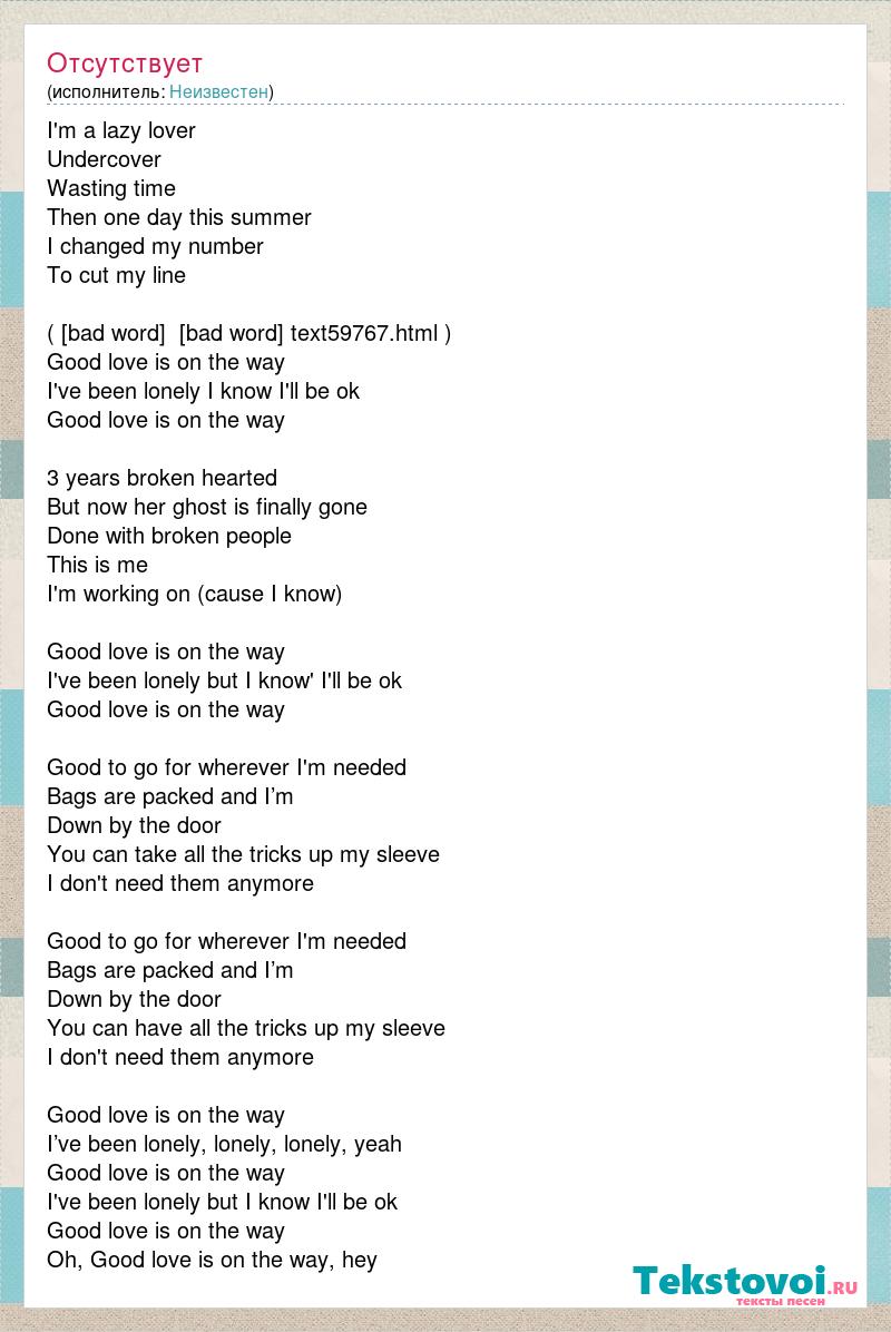 I'm a lazy lover Undercover Wasting time Then one day this summer I changed my number To cut my line ( [bad word] [bad word] text59767.html ) Good love is on the way I've been lonely I know I'll be ok Good love is on the way 3 years broken hearted But now her ghost is finally gone Done with broken people This is me I'm working on (cause I know) Good love is on the way I've been lonely but I know' I'll be ok Good love is on the way Good to go for wherever I'm needed Bags are packed and I’m Down by the door You can take all the tricks up my sleeve I don't need them anymore Good to go for wherever I'm needed Bags are packed and I’m Down by the door You can have all the tricks up my sleeve I don't need them anymore Good love is on the way I’ve been lonely, lonely, lonely, yeah Good love is on the way I've been lonely but I know I'll be ok Good love is on the way Oh, Good love is on the way, hey