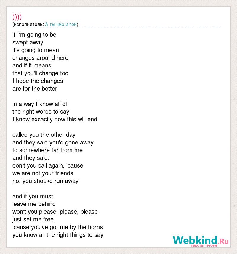 if I'm going to be swept away it's going to mean changes around here and if it means that you'll change too I hope the changes are for the better in a way I know all of the right words to say I know excactly how this will end called you the other day and they said you'd gone away to somewhere far from me and they said: don't you call again, 'cause we are not your friends no, you [bad word] away and if you must leave me behind won't you please, please, please just set me free 'cause you've got me by the horns you know all the right things to say