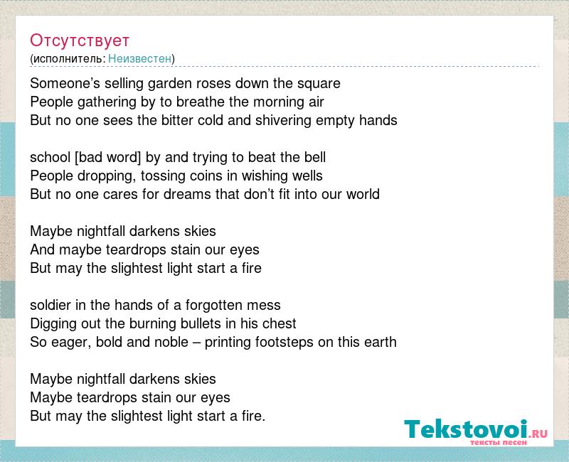 Someone’s selling garden roses down the square People gathering by to breathe the morning air But no one sees the bitter cold and shivering empty hands school [bad word] by and trying to beat the bell People dropping, tossing coins in wishing wells But no one cares for dreams that don’t fit into our world Maybe nightfall darkens skies And maybe teardrops stain our eyes But may the slightest light start a fire soldier in the hands of a forgotten mess Digging out the burning bullets in his chest So eager, bold and noble – printing footsteps on this earth Maybe nightfall darkens skies Maybe teardrops stain our eyes But may the slightest light start a fire.