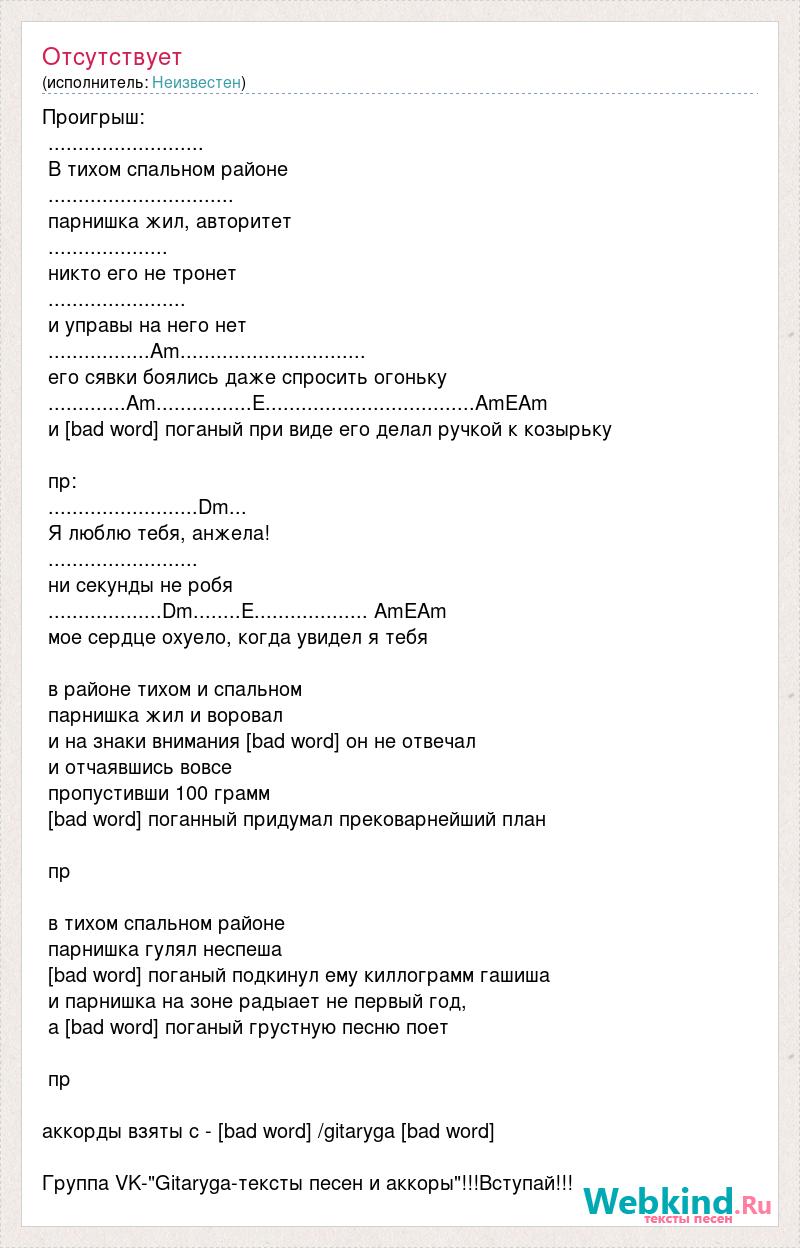 Проигрыш: .......................... В тихом спальном районе ............................... парнишка жил, авторитет .................... никто его не тронет ....................... и управы на него нет .................Am............................... его сявки боялись даже спросить огоньку .............Am................E...................................AmEAm и [bad word] поганый при виде его делал ручкой к козырьку пр: .........................Dm... Я люблю тебя, анжела! ......................... ни секунды не робя ...................Dm........E................... AmEAm мое сердце охуело, когда увидел я тебя в районе тихом и спальном парнишка жил и воровал и на знаки внимания [bad word] он не отвечал и отчаявшись вовсе пропустивши 100 грамм [bad word] поганный придумал прековарнейший план пр в тихом спальном районе парнишка гулял неспеша [bad word] поганый подкинул ему киллограмм гашиша и парнишка на зоне радыает не первый год, а [bad word] поганый грустную песню поет пр аккорды взяты с - [bad word] /gitaryga [bad word] Группа VK-"Gitaryga-тексты песен и аккоры"!!!Вступай!!!