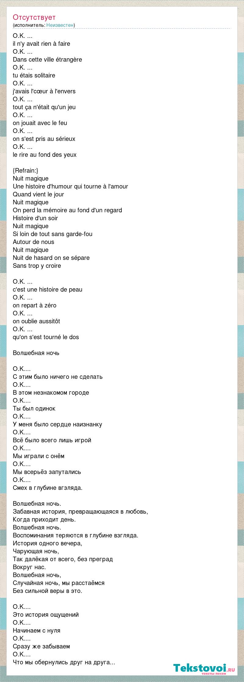 O.K. ... il n'y avait rien à faire O.K. ... Dans cette ville étrangère O.K. ... tu étais solitaire O.K. ... j'avais l'cœur à l'envers O.K. ... tout ça n'était qu'un jeu O.K. ... on jouait avec le feu O.K. ... on s'est pris au sérieux O.K. ... le rire au fond des yeux {Refrain:} Nuit magique Une histoire d'humour qui tourne à l'amour Quand vient le jour Nuit magique On perd la mémoire au fond d'un regard Histoire d'un soir Nuit magique Si loin de tout sans garde-fou Autour de nous Nuit magique Nuit de hasard on se sépare Sans trop y croire O.K. ... c'est une histoire de peau O.K. ... on repart à zéro O.K. ... on oublie aussitôt O.K. ... qu'on s'est tourné le dos Волшебная ночь O.K.... С этим было ничего не сделать O.K.... В этом незнакомом городе O.K.... Ты был одинок O.K.... У меня было сердце наизнанку O.K.... Всё было всего лишь игрой O.K.... Мы играли с онём O.K.... Мы всерьёз запутались O.K.... Смех в глубине вгзляда. Волшебная ночь. Забавная история, превращающаяся в любовь, Когда приходит день. Волшебная ночь. Воспоминания теряются в глубине взгляда. История одного вечера, Чарующая ночь, Так далёкая от всего, без преград Вокруг нас. Волшебная ночь, Случайная ночь, мы расстаёмся Без сильной веры в это. O.K.... Это история ощущений O.K.... Начинаем с нуля O.K.... Сразу же забываем O.K.... Что мы обернулись друг на друга...