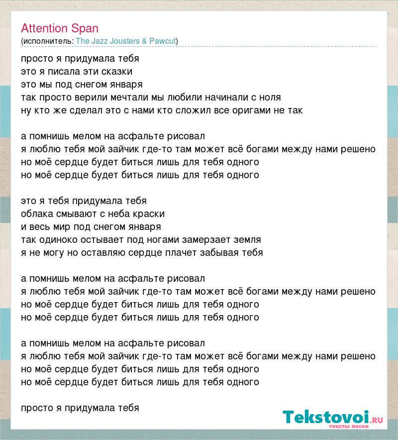 просто я придумала тебя это я писала эти сказки это мы под снегом января так просто верили мечтали мы любили начинали с ноля ну кто же сделал это с нами кто сложил все оригами не так а помнишь мелом на асфальте рисовал я люблю тебя мой зайчик где-то там может всё богами между нами решено но моё сердце будет биться лишь для тебя одного но моё сердце будет биться лишь для тебя одного это я тебя придумала тебя облака смывают с неба краски и весь мир под снегом января так одиноко остывает под ногами замерзает земля я не могу но оставляю сердце плачет забывая тебя а помнишь мелом на асфальте рисовал я люблю тебя мой зайчик где-то там может всё богами между нами решено но моё сердце будет биться лишь для тебя одного но моё сердце будет биться лишь для тебя одного а помнишь мелом на асфальте рисовал я люблю тебя мой зайчик где-то там может всё богами между нами решено но моё сердце будет биться лишь для тебя одного но моё сердце будет биться лишь для тебя одного просто я придумала тебя