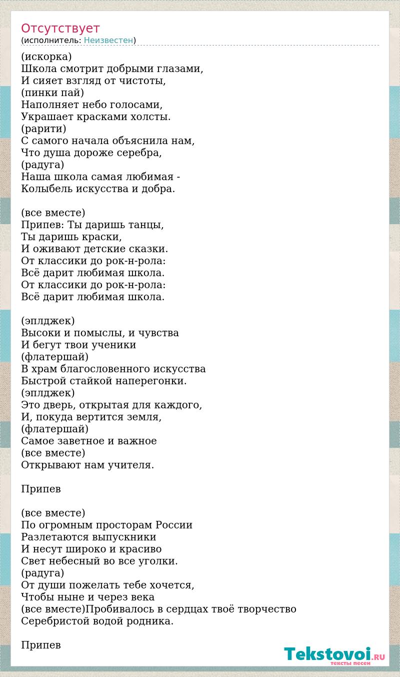 (искорка) Школа смотрит добрыми глазами, И сияет взгляд от чистоты, (пинки пай) Наполняет небо голосами, Украшает красками холсты. (рарити) С самого начала объяснила нам, Что душа дороже серебра, (радуга) Наша школа самая любимая - Колыбель искусства и добра. (все вместе) Припев: Ты даришь танцы, Ты даришь краски, И оживают детские сказки. От классики до рок-н-рола: Всё дарит любимая школа. От классики до рок-н-рола: Всё дарит любимая школа. (эплджек) Высоки и помыслы, и чувства И бегут твои ученики (флатершай) В храм благословенного искусства Быстрой стайкой наперегонки. (эплджек) Это дверь, открытая для каждого, И, покуда вертится земля, (флатершай) Самое заветное и важное (все вместе) Открывают нам учителя. Припев (все вместе) По огромным просторам России Разлетаются выпускники И несут широко и красиво Свет небесный во все уголки. (радуга) От души пожелать тебе хочется, Чтобы ныне и через века (все вместе)Пробивалось в сердцах твоё творчество Серебристой водой родника. Припев