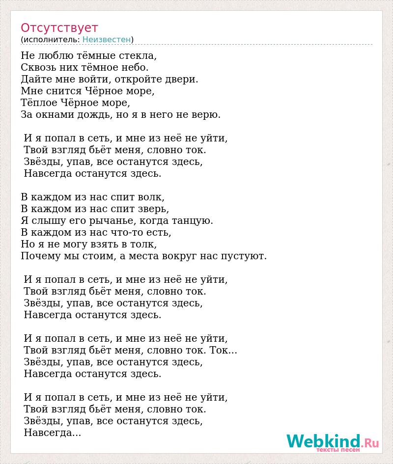 Не люблю тёмные стекла, Сквозь них тёмное небо. Дайте мне войти, откройте двери. Мне снится Чёрное море, Тёплое Чёрное море, За окнами дождь, но я в него не верю. И я попал в сеть, и мне из неё не уйти, Твой взгляд бьёт меня, словно ток. Звёзды, упав, все останутся здесь, Навсегда останутся здесь. В каждом из нас спит волк, В каждом из нас спит зверь, Я слышу его рычанье, когда танцую. В каждом из нас что-то есть, Но я не могу взять в толк, Почему мы стоим, а места вокруг нас пустуют. И я попал в сеть, и мне из неё не уйти, Твой взгляд бьёт меня, словно ток. Звёзды, упав, все останутся здесь, Навсегда останутся здесь. И я попал в сеть, и мне из неё не уйти, Твой взгляд бьёт меня, словно ток. Ток... Звёзды, упав, все останутся здесь, Навсегда останутся здесь. И я попал в сеть, и мне из неё не уйти, Твой взгляд бьёт меня, словно ток. Звёзды, упав, все останутся здесь, Навсегда...