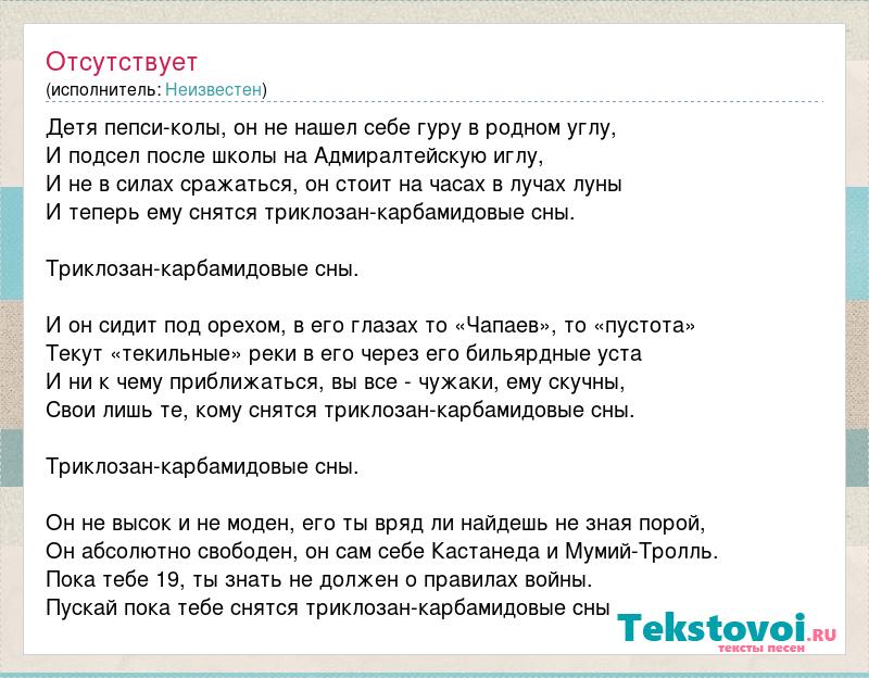 Детя пепси-колы, он не нашел себе гуру в родном углу, И подсел после школы на Адмиралтейскую иглу, И не в силах сражаться, он стоит на часах в лучах луны И теперь ему снятся триклозан-карбамидовые сны. Триклозан-карбамидовые сны. И он сидит под орехом, в его глазах то «Чапаев», то «пустота» Текут «текильные» реки в его через его бильярдные уста И ни к чему приближаться, вы все - чужаки, ему скучны, Свои лишь те, кому снятся триклозан-карбамидовые сны. Триклозан-карбамидовые сны. Он не высок и не моден, его ты вряд ли найдешь не зная порой, Он абсолютно свободен, он сам себе Кастанеда и Мумий-Тролль. Пока тебе 19, ты знать не должен о правилах войны. Пускай пока тебе снятся триклозан-карбамидовые сны