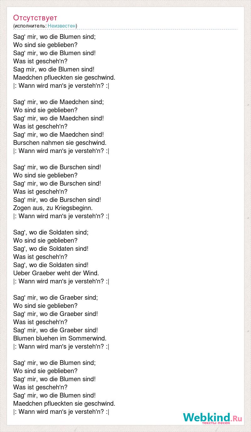 Sag' mir, wo die Blumen sind; Wo sind sie geblieben? Sag' mir, wo die Blumen sind! Was ist gescheh'n? Sag mir, wo die Blumen sind! Maedchen pflueckten sie geschwind. |: Wann wird man's je versteh'n? :| Sag' mir, wo die Maedchen sind; Wo sind sie geblieben? Sag' mir, wo die Maedchen sind! Was ist gescheh'n? Sag' mir, wo die Maedchen sind! Burschen nahmen sie geschwind. |: Wann wird man's je versteh'n? :| Sag' mir, wo die Burschen sind! Wo sind sie geblieben? Sag' mir, wo die Burschen sind! Was ist gescheh'n? Sag' mir, wo die Burschen sind! Zogen aus, zu Kriegsbeginn. |: Wann wird man's je versteh'n? :| Sag', wo die Soldaten sind; Wo sind sie geblieben? Sag', wo die Soldaten sind! Was ist gescheh'n? Sag', wo die Soldaten sind! Ueber Graeber weht der Wind. |: Wann wird man's je versteh'n? :| Sag' mir, wo die Graeber sind; Wo sind sie geblieben? Sag' mir, wo die Graeber sind! Was ist gescheh'n? Sag' mir, wo die Graeber sind! Blumen bluehen im Sommerwind. |: Wann wird man's je versteh'n? :| Sag' mir, wo die Blumen sind; Wo sind sie geblieben? Sag' mir, wo die Blumen sind! Was ist gescheh'n? Sag' mir, wo die Blumen sind! Maedchen pflueckten sie geschwind. |: Wann wird man's je versteh'n? :|