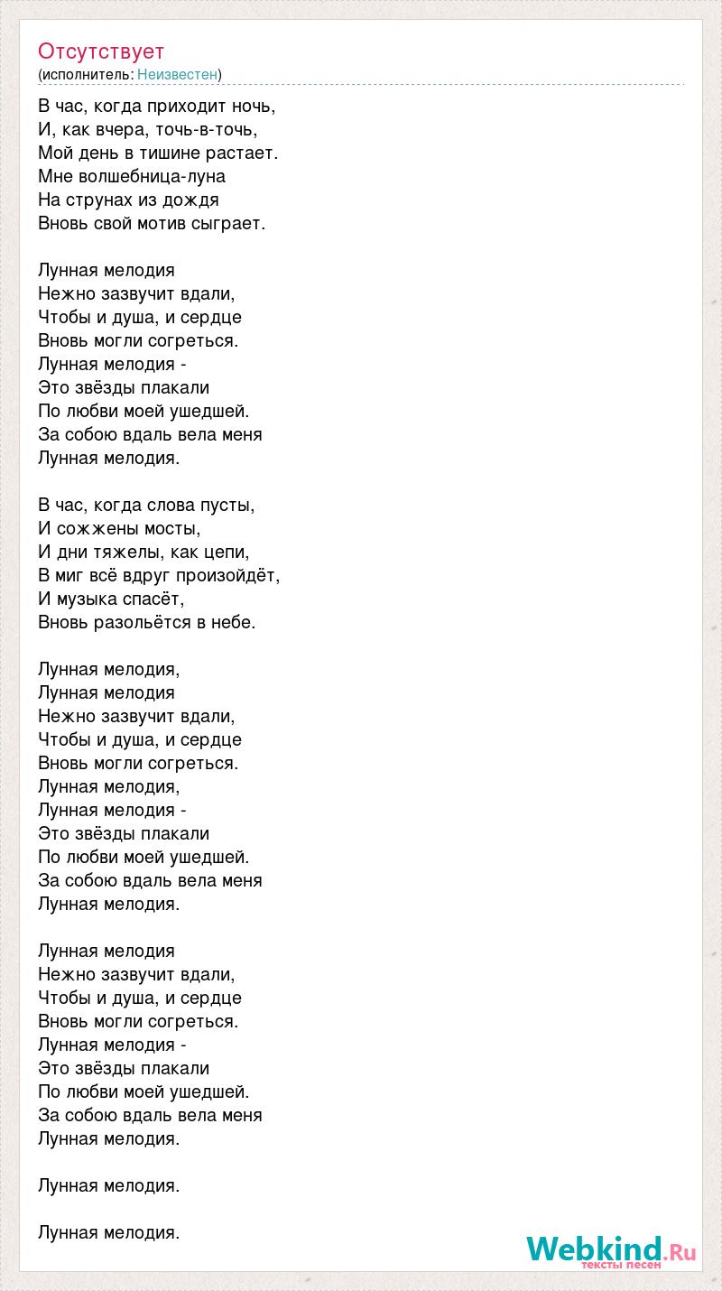 В час, когда приходит ночь, И, как вчера, точь-в-точь, Мой день в тишине растает. Мне волшебница-луна На струнах из дождя Вновь свой мотив сыграет. Лунная мелодия Нежно зазвучит вдали, Чтобы и душа, и сердце Вновь могли согреться. Лунная мелодия - Это звёзды плакали По любви моей ушедшей. За собою вдаль вела меня Лунная мелодия. В час, когда слова пусты, И сожжены мосты, И дни тяжелы, как цепи, В миг всё вдруг произойдёт, И музыка спасёт, Вновь разольётся в небе. Лунная мелодия, Лунная мелодия Нежно зазвучит вдали, Чтобы и душа, и сердце Вновь могли согреться. Лунная мелодия, Лунная мелодия - Это звёзды плакали По любви моей ушедшей. За собою вдаль вела меня Лунная мелодия. Лунная мелодия Нежно зазвучит вдали, Чтобы и душа, и сердце Вновь могли согреться. Лунная мелодия - Это звёзды плакали По любви моей ушедшей. За собою вдаль вела меня Лунная мелодия. Лунная мелодия. Лунная мелодия.