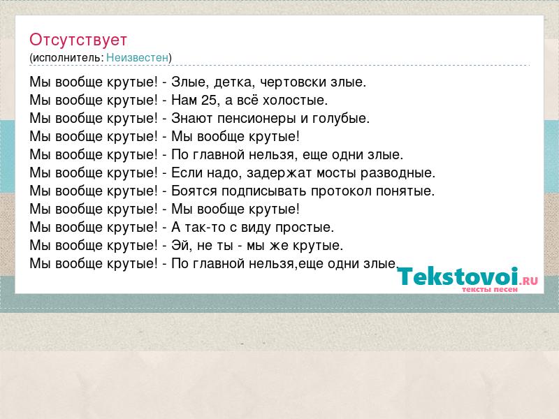 Мы вообще крутые! - Злые, детка, чертовски злые. Мы вообще крутые! - Нам 25, а всё холостые. Мы вообще крутые! - Знают пенсионеры и голубые. Мы вообще крутые! - Мы вообще крутые! Мы вообще крутые! - По главной нельзя, еще одни злые. Мы вообще крутые! - Если надо, задержат мосты разводные. Мы вообще крутые! - Боятся подписывать протокол понятые. Мы вообще крутые! - Мы вообще крутые! Мы вообще крутые! - А так-то с виду простые. Мы вообще крутые! - Эй, не ты - мы же крутые. Мы вообще крутые! - По главной нельзя,еще одни злые.