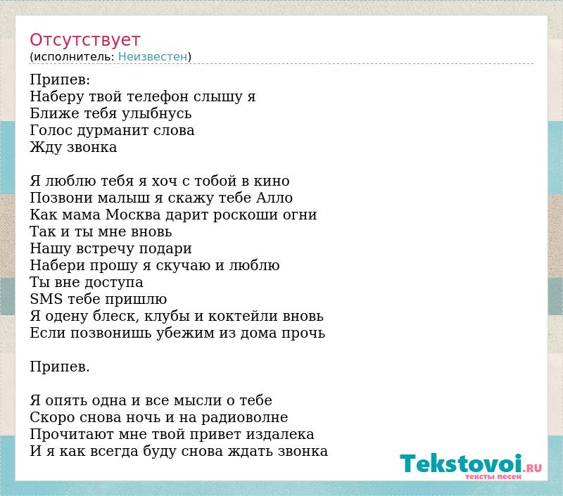 Припев: Наберу твой телефон слышу я Ближе тебя улыбнусь Голос дурманит слова Жду звонка Я люблю тебя я хоч с тобой в кино Позвони малыш я скажу тебе Алло Как мама Москва дарит роскоши огни Так и ты мне вновь Нашу встречу подари Набери прошу я скучаю и люблю Ты вне доступа SMS тебе пришлю Я одену блеск, клубы и коктейли вновь Если позвонишь убежим из дома прочь Припев. Я опять одна и все мысли о тебе Скоро снова ночь и на радиоволне Прочитают мне твой привет издалека И я как всегда буду снова ждать звонка
