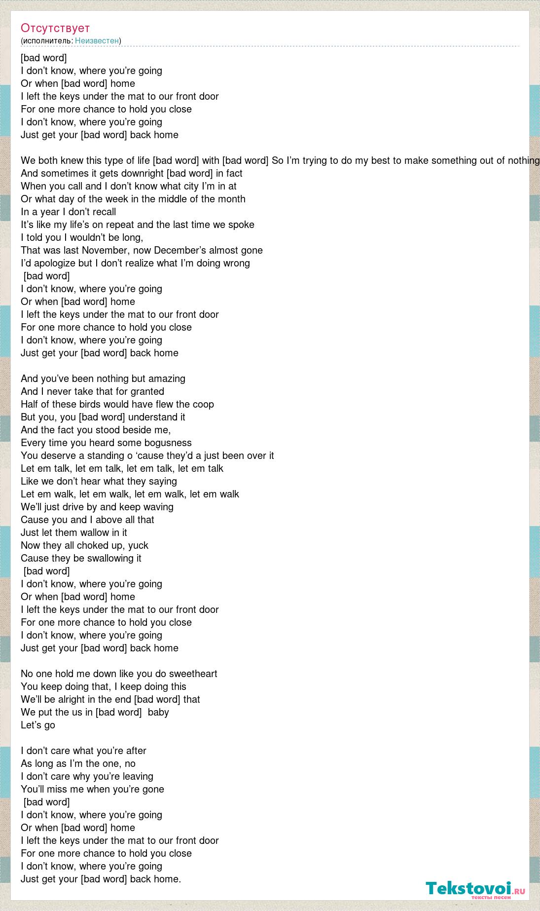[bad word] I don’t know, where you’re going Or when [bad word] home I left the keys under the mat to our front door For one more chance to hold you close I don’t know, where you’re going Just get your [bad word] back home We both knew this type of life [bad word] with [bad word] So I’m trying to do my best to make something out of nothing And sometimes it gets downright [bad word] in fact When you call and I don’t know what city I’m in at Or what day of the week in the middle of the month In a year I don’t recall It’s like my life’s on repeat and the last time we spoke I told you I wouldn’t be long, That was last November, now December’s almost gone I’d apologize but I don’t realize what I’m doing wrong [bad word] I don’t know, where you’re going Or when [bad word] home I left the keys under the mat to our front door For one more chance to hold you close I don’t know, where you’re going Just get your [bad word] back home And you’ve been nothing but amazing And I never take that for granted Half of these birds would have flew the coop But you, you [bad word] understand it And the fact you stood beside me, Every time you heard some bogusness You deserve a standing o ‘cause they’d a just been over it Let em talk, let em talk, let em talk, let em talk Like we don’t hear what they saying Let em walk, let em walk, let em walk, let em walk We’ll just drive by and keep waving Cause you and I above all that Just let them wallow in it Now they all choked up, yuck Cause they be swallowing it [bad word] I don’t know, where you’re going Or when [bad word] home I left the keys under the mat to our front door For one more chance to hold you close I don’t know, where you’re going Just get your [bad word] back home No one hold me down like you do sweetheart You keep doing that, I keep doing this We’ll be alright in the end [bad word] that We put the us in [bad word] baby Let’s go I don’t care what you’re after As long as I’m the one, no I don’t care why you’re leaving You’ll miss me when you’re gone [bad word] I don’t know, where you’re going Or when [bad word] home I left the keys under the mat to our front door For one more chance to hold you close I don’t know, where you’re going Just get your [bad word] back home.