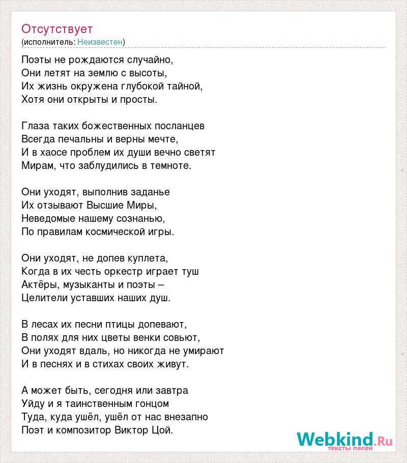 Поэты не рождаются случайно, Они летят на землю с высоты, Их жизнь окружена глубокой тайной, Хотя они открыты и просты. Глаза таких божественных посланцев Всегда печальны и верны мечте, И в хаосе проблем их души вечно светят Мирам, что заблудились в темноте. Они уходят, выполнив заданье Их отзывают Высшие Миры, Неведомые нашему сознанью, По правилам космической игры. Они уходят, не допев куплета, Когда в их честь оркестр играет туш Актёры, музыканты и поэты – Целители уставших наших душ. В лесах их песни птицы допевают, В полях для них цветы венки совьют, Они уходят вдаль, но никогда не умирают И в песнях и в стихах своих живут. А может быть, сегодня или завтра Уйду и я таинственным гонцом Туда, куда ушёл, ушёл от нас внезапно Поэт и композитор Виктор Цой.