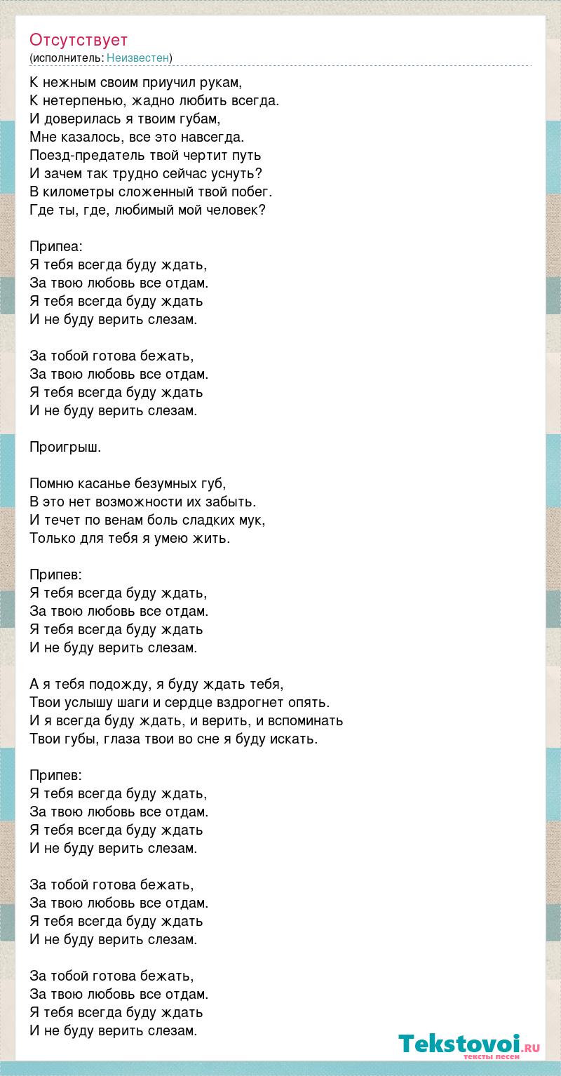 К нежным своим приучил рукам, К нетерпенью, жадно любить всегда. И доверилась я твоим губам, Мне казалось, все это навсегда. Поезд-предатель твой чертит путь И зачем так трудно сейчас уснуть? В километры сложенный твой побег. Где ты, где, любимый мой человек? Припеа: Я тебя всегда буду ждать, За твою любовь все отдам. Я тебя всегда буду ждать И не буду верить слезам. За тобой готова бежать, За твою любовь все отдам. Я тебя всегда буду ждать И не буду верить слезам. Проигрыш. Помню касанье безумных губ, В это нет возможности их забыть. И течет по венам боль сладких мук, Только для тебя я умею жить. Припев: Я тебя всегда буду ждать, За твою любовь все отдам. Я тебя всегда буду ждать И не буду верить слезам. А я тебя подожду, я буду ждать тебя, Твои услышу шаги и сердце вздрогнет опять. И я всегда буду ждать, и верить, и вспоминать Твои губы, глаза твои во сне я буду искать. Припев: Я тебя всегда буду ждать, За твою любовь все отдам. Я тебя всегда буду ждать И не буду верить слезам. За тобой готова бежать, За твою любовь все отдам. Я тебя всегда буду ждать И не буду верить слезам. За тобой готова бежать, За твою любовь все отдам. Я тебя всегда буду ждать И не буду верить слезам.