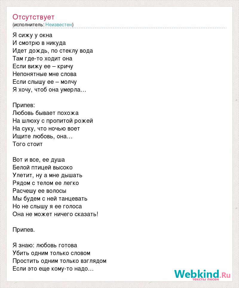 Я сижу у окна И смотрю в никуда Идет дождь, по стеклу вода Там где-то ходит она Если вижу ее – кричу Непонятные мне слова Если слышу ее – молчу Я хочу, чтоб она умерла… Припев: Любовь бывает похожа На шлюху с пропитой рожей На суку, что ночью воет Ищите любовь, она… Того стоит Вот и все, ее душа Белой птицей высоко Улетит, ну а мне дышать Рядом с телом ее легко Расчешу ее волосы Мы будем с ней танцевать Но не слышу я ее голоса Она не может ничего сказать! Припев. Я знаю: любовь готова Убить одним только словом Простить одним только взглядом Если это еще кому-то надо…