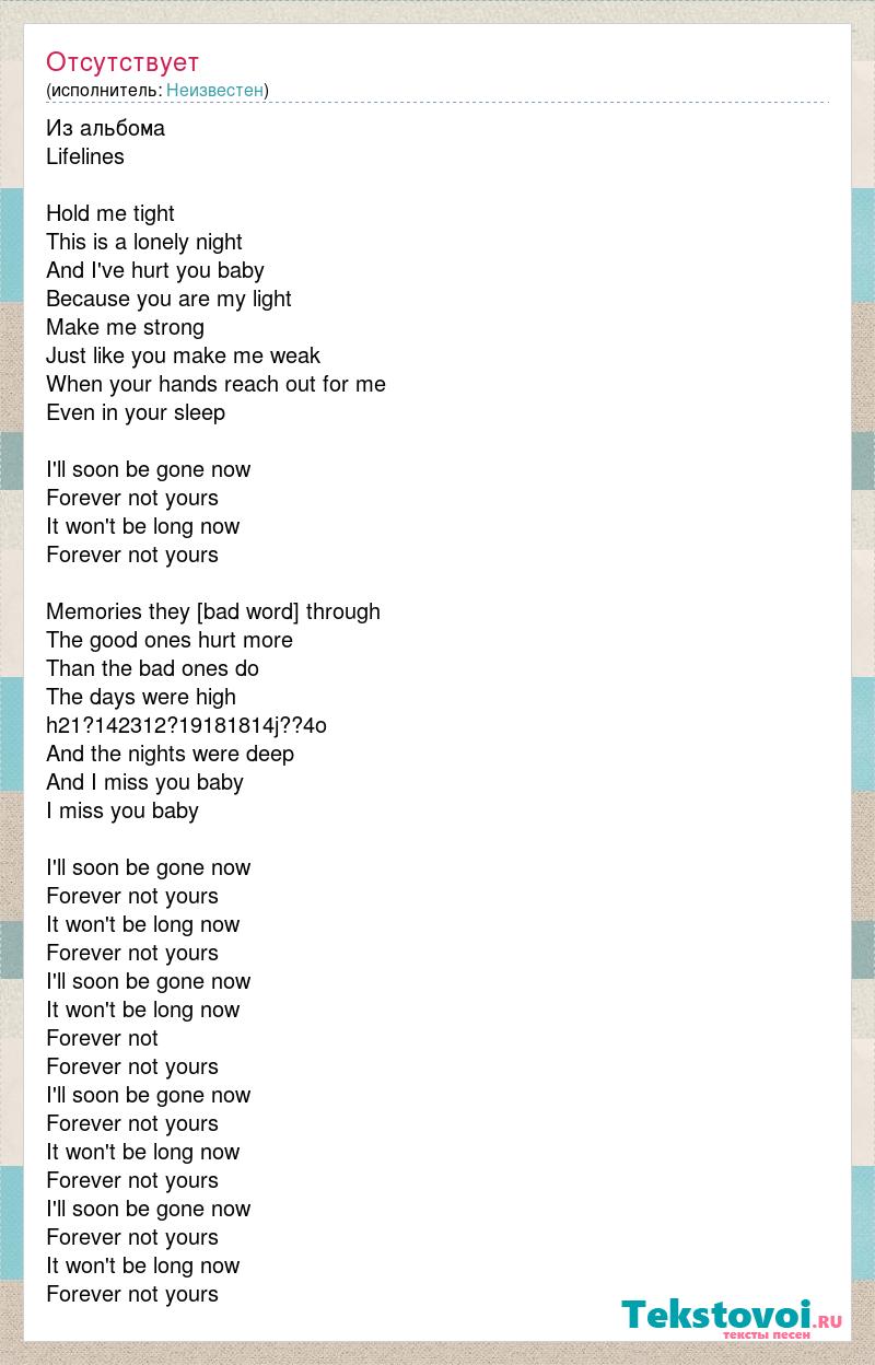 Из альбома Lifelines Hold me tight This is a lonely night And I've hurt you baby Because you are my light Make me strong Just like you make me weak When your hands reach out for me Even in your sleep I'll soon be gone now Forever not yours It won't be long now Forever not yours Memories they [bad word] through The good ones hurt more Than the bad ones do The days were high h21?142312?19181814j??4o And the nights were deep And I miss you baby I miss you baby I'll soon be gone now Forever not yours It won't be long now Forever not yours I'll soon be gone now It won't be long now Forever not Forever not yours I'll soon be gone now Forever not yours It won't be long now Forever not yours I'll soon be gone now Forever not yours It won't be long now Forever not yours