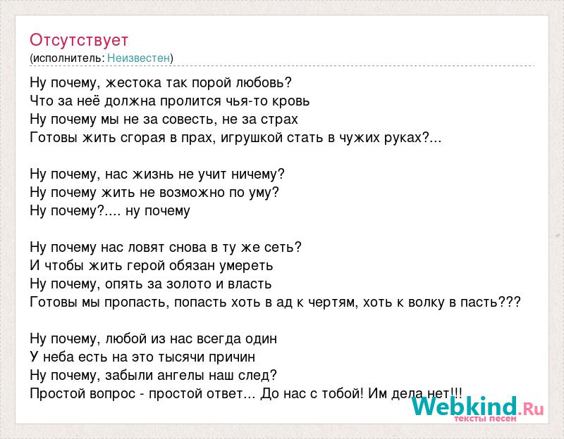 Ну почему, жестока так порой любовь? Что за неё должна пролится чья-то кровь Ну почему мы не за совесть, не за страх Готовы жить сгорая в прах, игрушкой стать в чужих руках?... Ну почему, нас жизнь не учит ничему? Ну почему жить не возможно по уму? Ну почему?.... ну почему Ну почему нас ловят снова в ту же сеть? И чтобы жить герой обязан умереть Ну почему, опять за золото и власть Готовы мы пропасть, попасть хоть в ад к чертям, хоть к волку в пасть??? Ну почему, любой из нас всегда один У неба есть на это тысячи причин Ну почему, забыли ангелы наш след? Простой вопрос - простой ответ... До нас с тобой! Им дела нет!!!