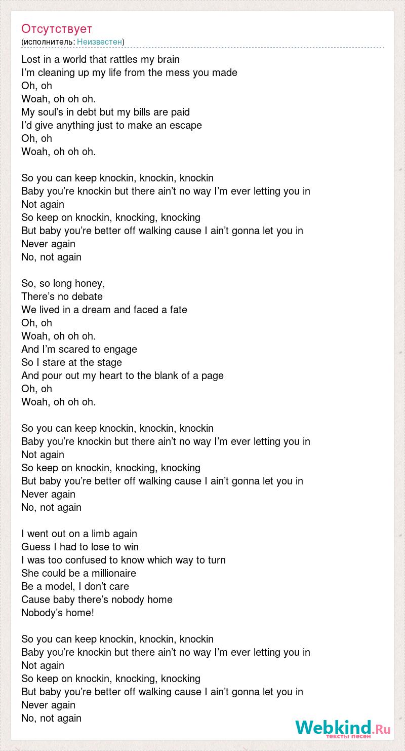 Lost in a world that rattles my brain I’m cleaning up my life from the mess you made Oh, oh Woah, oh oh oh. My soul’s in debt but my bills are paid I’d give anything just to make an escape Oh, oh Woah, oh oh oh. So you can keep knockin, knockin, knockin Baby you’re knockin but there ain’t no way I’m ever letting you in Not again So keep on knockin, knocking, knocking But baby you’re better off walking cause I ain’t gonna let you in Never again No, not again So, so long honey, There’s no debate We lived in a dream and faced a fate Oh, oh Woah, oh oh oh. And I’m scared to engage So I stare at the stage And pour out my heart to the blank of a page Oh, oh Woah, oh oh oh. So you can keep knockin, knockin, knockin Baby you’re knockin but there ain’t no way I’m ever letting you in Not again So keep on knockin, knocking, knocking But baby you’re better off walking cause I ain’t gonna let you in Never again No, not again I went out on a limb again Guess I had to lose to win I was too confused to know which way to turn She could be a millionaire Be a model, I don’t care Cause baby there’s nobody home Nobody’s home! So you can keep knockin, knockin, knockin Baby you’re knockin but there ain’t no way I’m ever letting you in Not again So keep on knockin, knocking, knocking But baby you’re better off walking cause I ain’t gonna let you in Never again No, not again