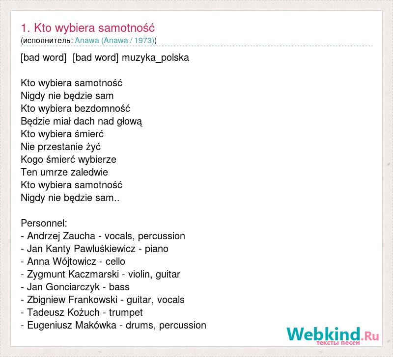 [bad word] [bad word] muzyka_polska Kto wybiera samotność Nigdy nie będzie sam Kto wybiera bezdomność Będzie miał dach nad głową Kto wybiera śmierć Nie przestanie żyć Kogo śmierć wybierze Ten umrze zaledwie Kto wybiera samotność Nigdy nie będzie sam.. Personnel: - Andrzej Zaucha - vocals, percussion - Jan Kanty Pawluśkiewicz - piano - Anna Wójtowicz - cello - Zygmunt Kaczmarski - violin, guitar - Jan Gonciarczyk - bass - Zbigniew Frankowski - guitar, vocals - Tadeusz Kożuch - [bad word] - Eugeniusz Makówka - [bad word] percussion