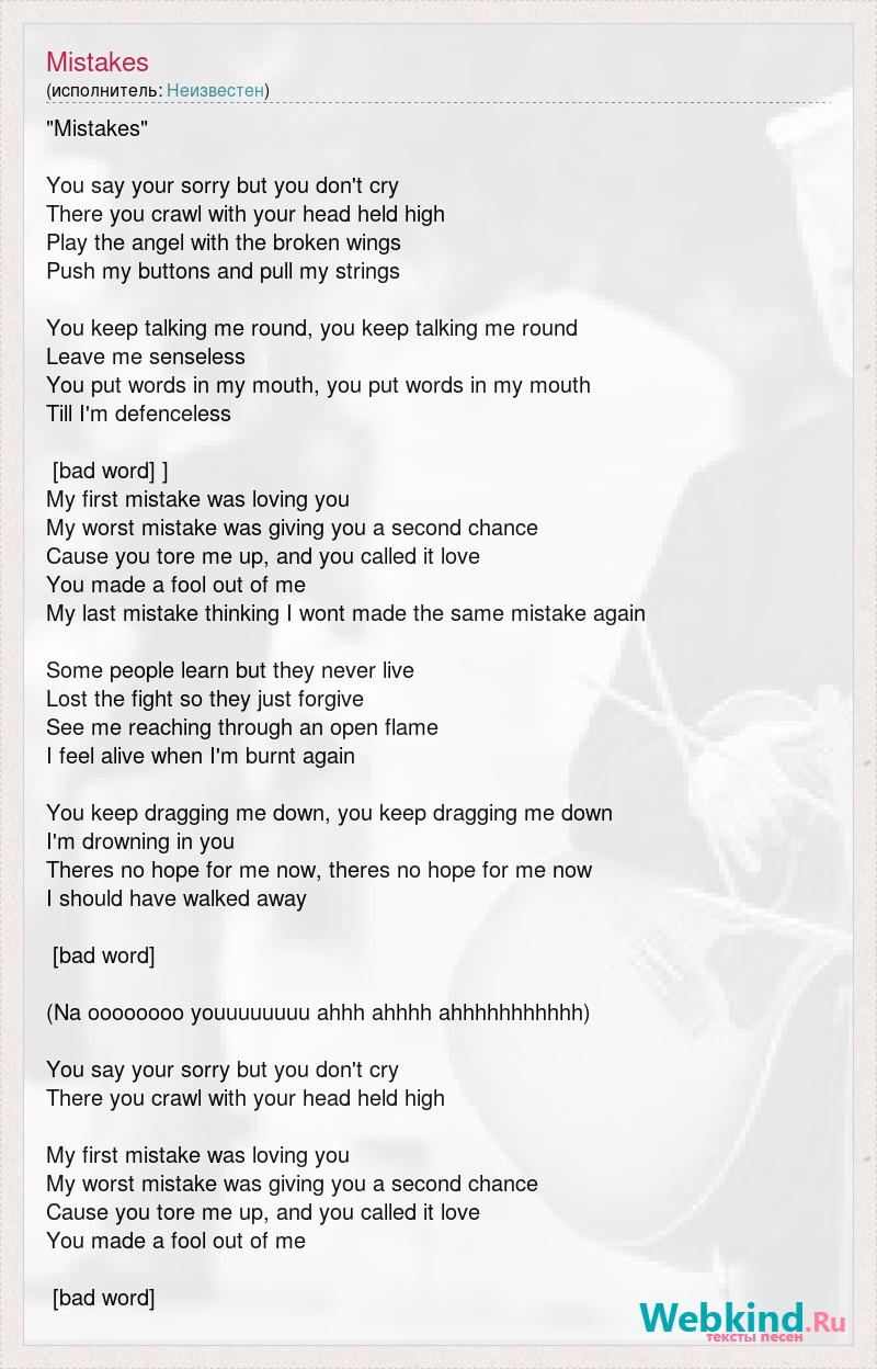 "Mistakes" You say your sorry but you don't cry There you crawl with your head held high Play the angel with the broken wings Push my buttons and pull my strings You keep talking me round, you keep talking me round Leave me senseless You put words in my mouth, you put words in my mouth Till I'm defenceless [bad word] ] My first mistake was loving you My worst mistake was giving you a second chance Cause you tore me up, and you called it love You made a fool out of me My last mistake thinking I wont made the same mistake again Some people learn but they never live Lost the fight so they just forgive See me reaching through an open flame I feel alive when I'm burnt again You keep dragging me down, you keep dragging me down I'm drowning in you Theres no hope for me now, theres no hope for me now I should have walked away [bad word] (Na oooooooo youuuuuuuu ahhh ahhhh ahhhhhhhhhhh) You say your sorry but you don't cry There you crawl with your head held high My first mistake was loving you My worst mistake was giving you a second chance Cause you tore me up, and you called it love You made a fool out of me [bad word]