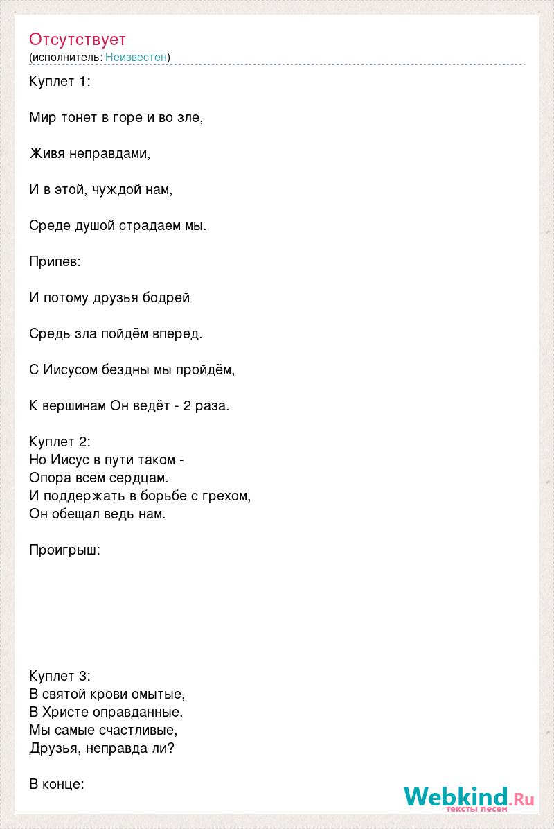 Куплет 1: Мир тонет в горе и во зле, Живя неправдами, И в этой, чуждой нам, Среде душой страдаем мы. Припев: И потому друзья бодрей Средь зла пойдём вперед. С Иисусом бездны мы пройдём, К вершинам Он ведёт - 2 раза. Куплет 2: Но Иисус в пути таком - Опора всем сердцам. И поддержать в борьбе с грехом, Он обещал ведь нам. Проигрыш: Куплет 3: В святой крови омытые, В Христе оправданные. Мы самые счастливые, Друзья, неправда ли? В конце: