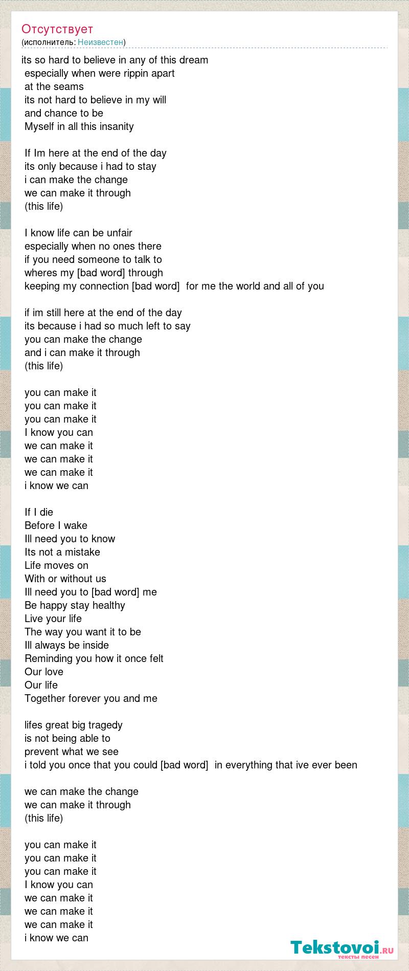 its so hard to believe in any of this dream especially when were rippin apart at the seams its not hard to believe in my will and chance to be Myself in all this insanity If Im here at the end of the day its only because i had to stay i can make the change we can make it through (this life) I know life can be unfair especially when no ones there if you need someone to talk to wheres my [bad word] through keeping my connection [bad word] for me the world and all of you if im still here at the end of the day its because i had so much left to say you can make the change and i can make it through (this life) you can make it you can make it you can make it I know you can we can make it we can make it we can make it i know we can If I die Before I wake Ill need you to know Its not a mistake Life moves on With or without us Ill need you to [bad word] me Be happy stay healthy Live your life The way you want it to be Ill always be inside Reminding you how it once felt Our love Our life Together forever you and me lifes great big tragedy is not being able to prevent what we see i told you once that you could [bad word] in everything that ive ever been we can make the change we can make it through (this life) you can make it you can make it you can make it I know you can we can make it we can make it we can make it i know we can