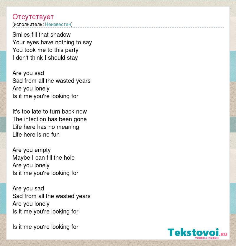 Smiles fill that shadow Your eyes have nothing to say You took me to this party I don't think I should stay Are you sad Sad from all the wasted years Are you lonely Is it me you're looking for It's too late to turn back now The infection has been gone Life here has no meaning Life here is no fun Are you empty Maybe I can fill the hole Are you lonely Is it me you're looking for Are you sad Sad from all the wasted years Are you lonely Is it me you're looking for Is it me you're looking for