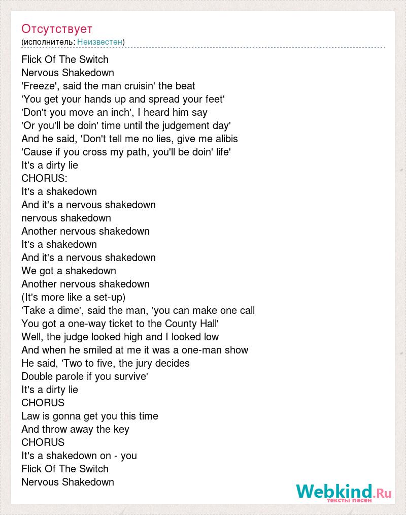 Flick Of The Switch Nervous Shakedown 'Freeze', said the man [bad word] #39; the beat 'You get your hands up and spread your feet' 'Don't you move an inch', I heard him say 'Or you'll be doin' time until the judgement day' And he said, 'Don't tell me no lies, give me alibis 'Cause if you cross my path, you'll be doin' life' It's a dirty lie [bad word] It's a shakedown And it's a nervous shakedown nervous shakedown Another nervous shakedown It's a shakedown And it's a nervous shakedown We got a shakedown Another nervous shakedown (It's more like a set-up) 'Take a dime', said the man, 'you can make one call You got a one-way ticket to the County Hall' Well, the judge looked high and I looked low And when he smiled at me it was a one-man show He said, 'Two to five, the jury decides Double parole if you survive' It's a dirty lie [bad word] Law is gonna get you this time And throw away the key [bad word] It's a shakedown on - you Flick Of The Switch Nervous Shakedown