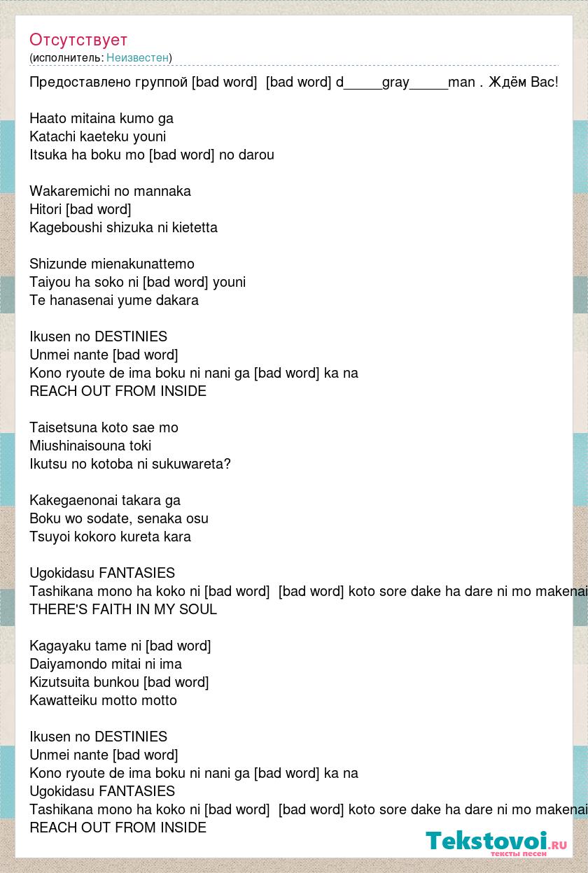 Предоставлено группой [bad word] [bad word] d_____gray_____man . Ждём Вас! Haato mitaina kumo ga Katachi kaeteku youni Itsuka ha boku mo [bad word] no darou Wakaremichi no mannaka Hitori [bad word] Kageboushi shizuka ni kietetta Shizunde mienakunattemo Taiyou ha soko ni [bad word] youni Te hanasenai yume dakara Ikusen no DESTINIES Unmei nante [bad word] Kono ryoute de ima boku ni nani ga [bad word] ka na REACH OUT FROM INSIDE Taisetsuna koto sae mo Miushinaisouna toki Ikutsu no kotoba ni sukuwareta? Kakegaenonai takara ga Boku wo sodate, senaka osu Tsuyoi kokoro kureta kara Ugokidasu FANTASIES Tashikana mono ha koko ni [bad word] [bad word] koto sore dake ha dare ni mo makenai THERE'S FAITH IN MY SOUL Kagayaku tame ni [bad word] Daiyamondo mitai ni ima Kizutsuita bunkou [bad word] Kawatteiku motto motto Ikusen no DESTINIES Unmei nante [bad word] Kono ryoute de ima boku ni nani ga [bad word] ka na Ugokidasu FANTASIES Tashikana mono ha koko ni [bad word] [bad word] koto sore dake ha dare ni mo makenai REACH OUT FROM INSIDE