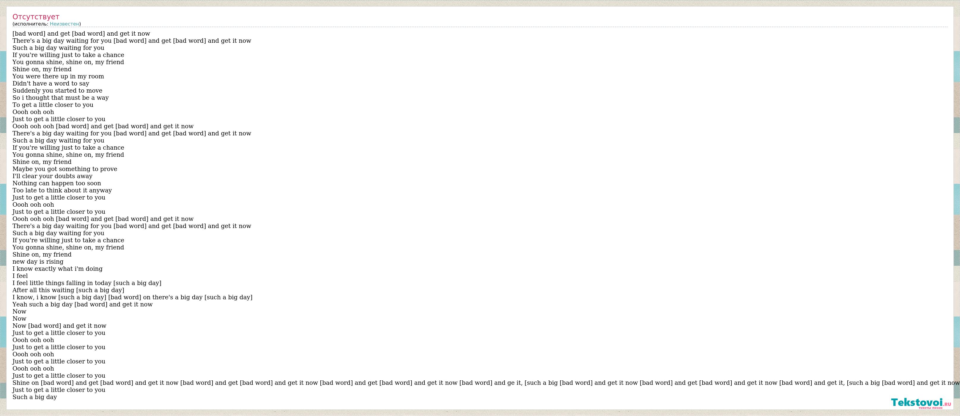 [bad word] and get [bad word] and get it now There's a big day waiting for you [bad word] and get [bad word] and get it now Such a big day waiting for you If you're willing just to take a chance You gonna shine, shine on, my friend Shine on, my friend You were there up in my room Didn't have a word to say Suddenly you started to move So i thought that must be a way To get a little closer to you Oooh ooh ooh Just to get a little closer to you Oooh ooh ooh [bad word] and get [bad word] and get it now There's a big day waiting for you [bad word] and get [bad word] and get it now Such a big day waiting for you If you're willing just to take a chance You gonna shine, shine on, my friend Shine on, my friend Maybe you got something to prove I'll clear your doubts away Nothing can happen too soon Too late to think about it anyway Just to get a little closer to you Oooh ooh ooh Just to get a little closer to you Oooh ooh ooh [bad word] and get [bad word] and get it now There's a big day waiting for you [bad word] and get [bad word] and get it now Such a big day waiting for you If you're willing just to take a chance You gonna shine, shine on, my friend Shine on, my friend new day is rising I know exactly what i'm doing I feel I feel little things falling in today [such a big day] After all this waiting [such a big day] I know, i know [such a big day] [bad word] on there's a big day [such a big day] Yeah such a big day [bad word] and get it now Now Now Now [bad word] and get it now Just to get a little closer to you Oooh ooh ooh Just to get a little closer to you Oooh ooh ooh Just to get a little closer to you Oooh ooh ooh Just to get a little closer to you Shine on [bad word] and get [bad word] and get it now [bad word] and get [bad word] and get it now [bad word] and get [bad word] and get it now [bad word] and ge it, [such a big [bad word] and get it now [bad word] and get [bad word] and get it now [bad word] and get it, [such a big [bad word] and get it now Just to get a little closer to you Such a big day