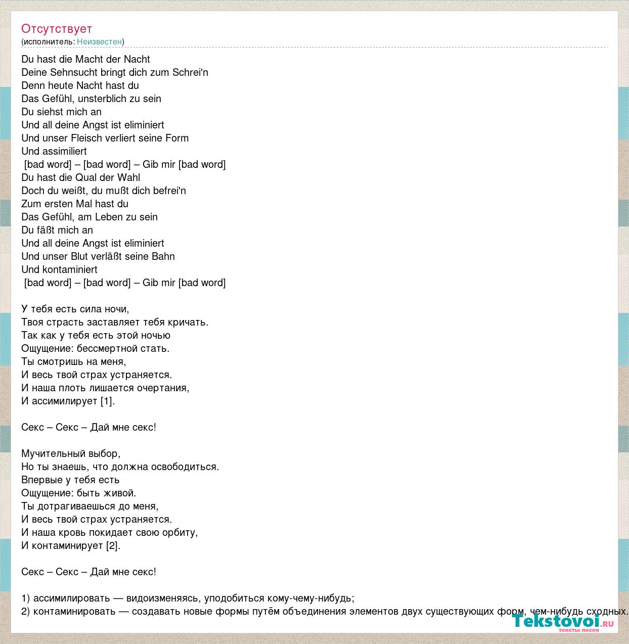 Du hast die Macht der Nacht Deine Sehnsucht bringt dich zum Schrei'n Denn heute Nacht hast du Das Gefühl, unsterblich zu sein Du siehst mich an Und all deine Angst ist eliminiert Und unser Fleisch verliert seine Form Und assimiliert [bad word] – [bad word] – Gib mir [bad word] Du hast die Qual der Wahl Doch du weißt, du mußt dich befrei'n Zum ersten Mal hast du Das Gefühl, am Leben zu sein Du fäßt mich an Und all deine Angst ist eliminiert Und unser Blut verläßt seine Bahn Und kontaminiert [bad word] – [bad word] – Gib mir [bad word] У тебя есть сила ночи, Твоя страсть заставляет тебя кричать. Так как у тебя есть этой ночью Ощущение: бессмертной стать. Ты смотришь на меня, И весь твой страх устраняется. И наша плоть лишается очертания, И ассимилирует [1]. Секс – Секс – Дай мне секс! Мучительный выбор, Но ты знаешь, что должна освободиться. Впервые у тебя есть Ощущение: быть живой. Ты дотрагиваешься до меня, И весь твой страх устраняется. И наша кровь покидает свою орбиту, И контаминирует [2]. Секс – Секс – Дай мне секс! 1) ассимилировать — видоизменяясь, уподобиться кому-чему-нибудь; 2) контаминировать — создавать новые формы путём объединения элементов двух существующих форм, чем-нибудь сходных.