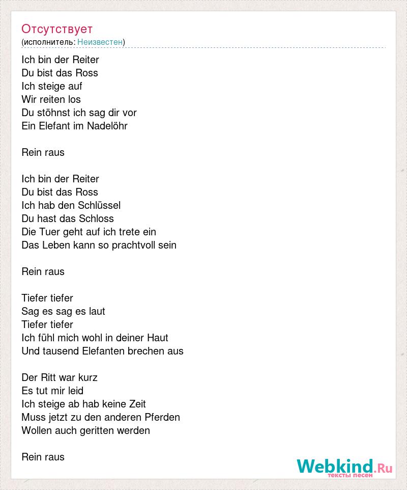 Ich bin der Reiter Du bist das Ross Ich steige auf Wir reiten los Du stöhnst ich sag dir vor Ein Elefant im Nadelöhr Rein raus Ich bin der Reiter Du bist das Ross Ich hab den Schlüssel Du hast das Schloss Die Tuer geht auf ich trete ein Das Leben kann so prachtvoll sein Rein raus Tiefer tiefer Sag es sag es laut Tiefer tiefer Ich fühl mich wohl in deiner Haut Und tausend Elefanten brechen aus Der Ritt war kurz Es tut mir leid Ich steige ab hab keine Zeit Muss jetzt zu den anderen Pferden Wollen auch geritten werden Rein raus