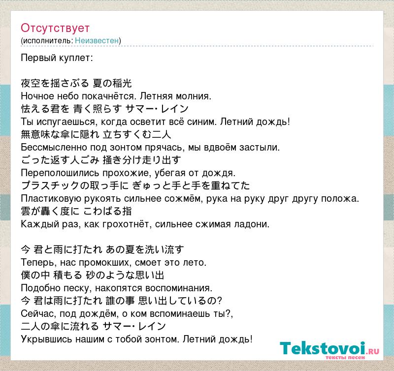 Первый куплет: 夜空を揺さぶる 夏の稲光 Ночное небо покачнётся. Летняя молния. 怯える君を 青く照らす サマー・レイン Ты испугаешься, когда осветит всё синим. Летний дождь! 無意味な傘に隠れ 立ちすくむ二人 Бессмысленно под зонтом прячась, мы вдвоём застыли. ごった返す人ごみ 掻き分け走り出す Переполошились прохожие, убегая от дождя. プラスチックの取っ手に ぎゅっと手と手を重ねてた Пластиковую рукоять сильнее сожмём, рука на руку друг другу положа. 雲が轟く度に こわばる指 Каждый раз, как грохотнёт, сильнее сжимая ладони. 今 君と雨に打たれ あの夏を洗い流す Теперь, нас промокших, смоет это лето. 僕の中 積もる 砂のような思い出 Подобно песку, накопятся воспоминания. 今 君は雨に打たれ 誰の事 思い出しているの? Сейчас, под дождём, о ком вспоминаешь ты?, 二人の傘に流れる サマー・レイン Укрывшись нашим с тобой зонтом. Летний дождь!
