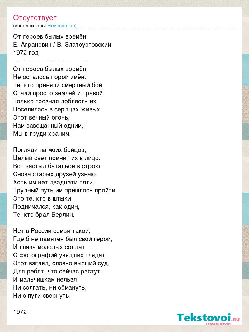 От героев былых времён Е. Агранович / В. Златоустовский 1972 год ------------------------------------- От героев былых времён Не осталось порой имён. Те, кто приняли смертный бой, Стали просто землёй и травой. Только грозная доблесть их Поселилась в сердцах живых, Этот вечный огонь, Нам завещанный одним, Мы в груди храним. Погляди на моих бойцов, Целый свет помнит их в лицо. Вот застыл батальон в строю, Снова старых друзей узнаю. Хоть им нет двадцати пяти, Трудный путь им пришлось пройти. Это те, кто в штыки Поднимался, как один, Те, кто брал Берлин. Нет в России семьи такой, Где б не памятен был свой герой, И глаза молодых солдат С фотографий увядших глядят. Этот взгляд, словно высший суд, Для ребят, что сейчас растут. И мальчишкам нельзя Ни солгать, ни обмануть, Ни с пути свернуть. 1972