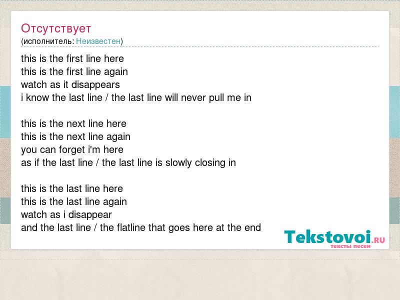 this is the first line here this is the first line again watch as it disappears i know the last line / the last line will never pull me in this is the next line here this is the next line again you can forget i'm here as if the last line / the last line is slowly closing in this is the last line here this is the last line again watch as i disappear and the last line / the flatline that goes here at the end