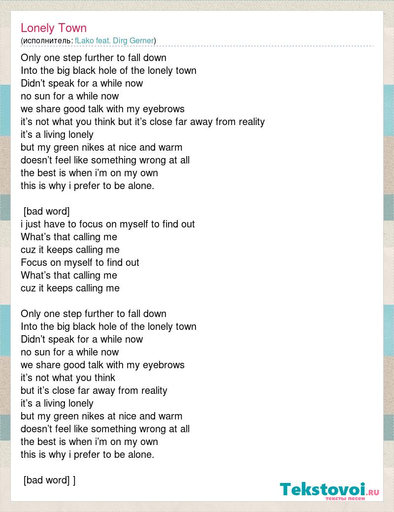 Only one step further to fall down Into the big black hole of the lonely town Didn’t speak for a while now no sun for a while now we share good talk with my eyebrows it’s not what you think but it’s close far away from reality it’s a living lonely but my green nikes at nice and warm doesn’t feel like something wrong at all the best is when i’m on my own this is why i prefer to be alone. [bad word] i just have to focus on myself to find out What’s that calling me cuz it keeps calling me Focus on myself to find out What’s that calling me cuz it keeps calling me Only one step further to fall down Into the big black hole of the lonely town Didn’t speak for a while now no sun for a while now we share good talk with my eyebrows it’s not what you think but it’s close far away from reality it’s a living lonely but my green nikes at nice and warm doesn’t feel like something wrong at all the best is when i’m on my own this is why i prefer to be alone. [bad word] ]