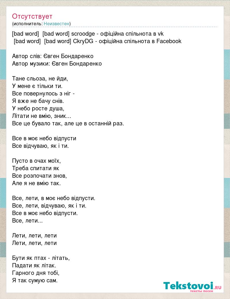 [bad word] [bad word] scroodge - офіційна спільнота в vk [bad word] [bad word] CkryDG - офіційна спільнота в Facebook Автор слів: Євген Бондаренко Автор музики: Євген Бондаренко Тане сльоза, не йди, У мене є тільки ти. Все повернулось з ніг - Я вже не бачу снів. У небо росте душа, Літати не вмію, зник... Все це бувало так, але це в останній раз. Все в моє небо відпусти Все відчуваю, як і ти. Пусто в очах моїх, Треба спитати як Все розпочати знов, Але я не вмію так. Все, лети, в моє небо відпусти. Все, лети, відчуваю, як і ти. Все в моє небо відпусти. Все, лети... Лети, лети, лети Лети, лети, лети Бути як птах - літать, Падати як літак. Гарного дня тобі, Я так сумую сам.