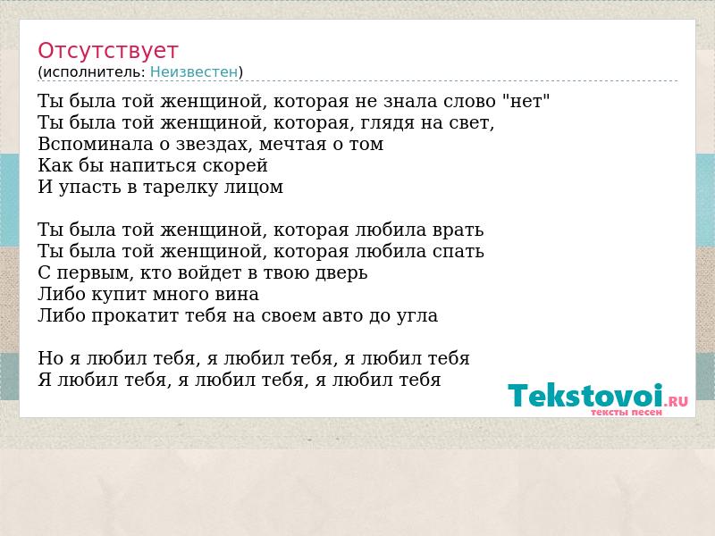 Ты была той женщиной, которая не знала слово "нет" Ты была той женщиной, которая, глядя на свет, Вспоминала о звездах, мечтая о том Как бы напиться скорей И упасть в тарелку лицом Ты была той женщиной, которая любила врать Ты была той женщиной, которая любила спать С первым, кто войдет в твою дверь Либо купит много вина Либо прокатит тебя на своем авто до угла Но я любил тебя, я любил тебя, я любил тебя Я любил тебя, я любил тебя, я любил тебя