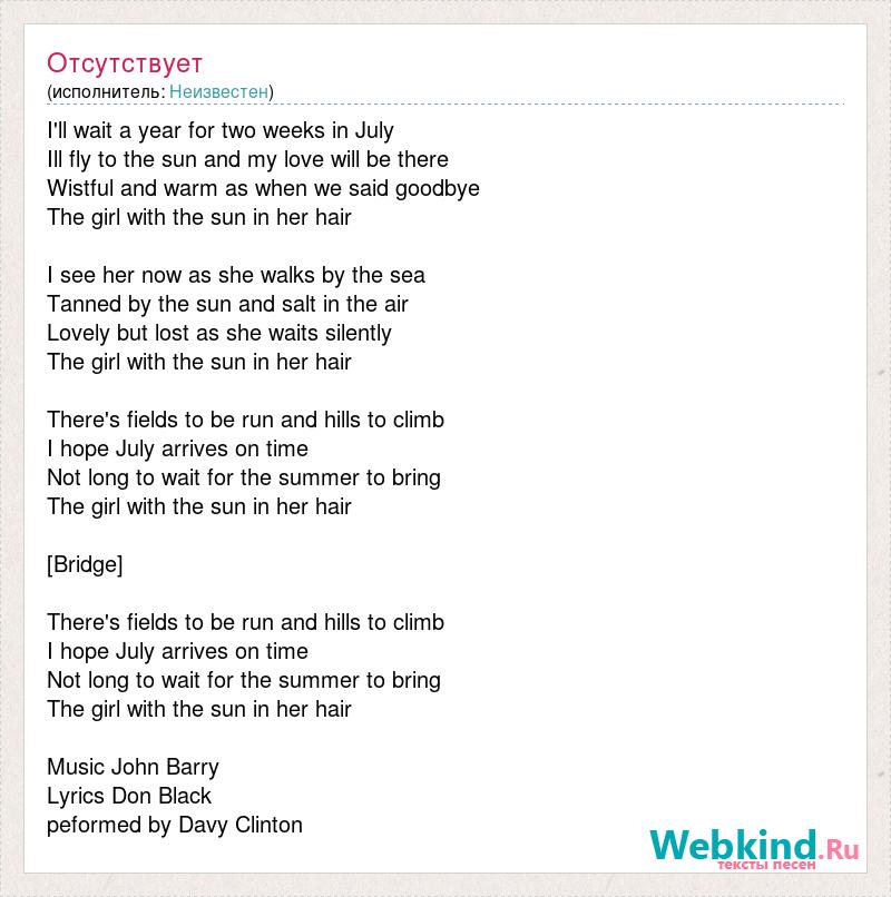 I'll wait a year for two weeks in July Ill fly to the sun and my love will be there Wistful and warm as when we said goodbye The girl with the sun in her hair I see her now as she walks by the sea Tanned by the sun and salt in the air Lovely but lost as she waits silently The girl with the sun in her hair There's fields to [bad word] and hills to climb I hope July arrives on time Not long to wait for the summer to bring The girl with the sun in her hair [Bridge] There's fields to [bad word] and hills to climb I hope July arrives on time Not long to wait for the summer to bring The girl with the sun in her hair Music John Barry Lyrics Don Black peformed by Davy Clinton