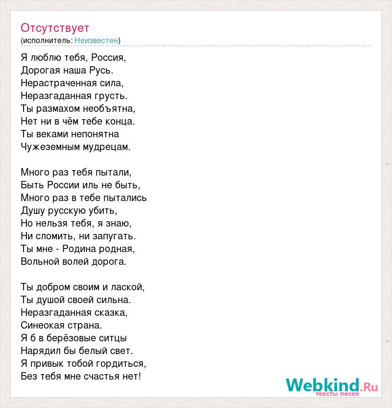 Я люблю тебя, Россия, Дорогая наша Русь. Нерастраченная сила, Неразгаданная грусть. Ты размахом необъятна, Нет ни в чём тебе конца. Ты веками непонятна Чужеземным мудрецам. Много раз тебя пытали, Быть России иль не быть, Много раз в тебе пытались Душу русскую убить, Но нельзя тебя, я знаю, Ни сломить, ни запугать. Ты мне - Родина родная, Вольной волей дорога. Ты добром своим и лаской, Ты душой своей сильна. Неразгаданная сказка, Синеокая страна. Я б в берёзовые ситцы Нарядил бы белый свет. Я привык тобой гордиться, Без тебя мне счастья нет!