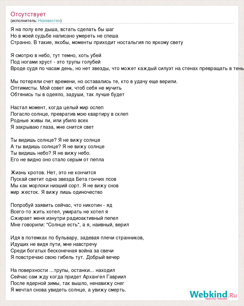 Я на полу еле дыша, встать сделать бы шаг Но в моей судьбе написано умереть не спеша Странно. В такие, якобы, моменты приходит ностальгия по яркому свету Я смотрю в небо, тут темно, хоть убей Под ногами хруст - это трупы голубей Вроде судя по часам день, но нет звезды, что может каждый силуэт на стенах превращать в тень Мы потеряли счет времени, но оставались те, кто в удачу еще верили. Оптимисты. Мой совет им, чтоб себя не мучить Обтянись ты в одеяло, задуши, так лучше будет Настал момент, когда целый мир ослеп Погасло солнце, превратив мою квартиру в склеп Родные живы ли, или убило всех Я закрываю глаза, мне снится свет Ты видишь солнце? Я не вижу солнце А ты видишь солнце? Я не вижу солнце Ты видишь небо? Я не вижу небо. Его не видно оно стало серым от пепла Жизнь кротов. Нет, это не кончится Пускай светит одна звезда Бета гончих псов Мы как морлоки низший сорт. Я не вижу снов мир жесток. Я вижу лишь одиночество Попробуй заявить сейчас, что никотин - яд Всего-то жить хотел, умирать не хотел я Сжирает меня изнутри радиоактивный пепел Мне говорили: "Солнце есть", а я, наивный, верил Идя в потемках по бульвару, задевая плечи странников, Идущих не видя пути, мне навстречу Среди богатых бесконечная война за свечи Я повстречаю свою гибель тут. Добрый вечер На поверхности ...трупы, останки... находил Сейчас сам жду когда придет Архангел Гавриил После ядерной зимы, так вышло, ненавижу снег Я мечтал снова увидеть солнце, а увижу смерть.