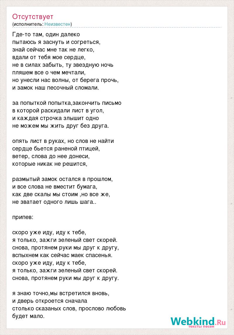 Где-то там, один далеко пытаюсь я заснуть и согреться, знай сейчас мне так не легко, вдали от тебя мое сердце, не в силах забыть, ту звездную ночь пляшем все о чем мечтали, но унесли нас волны, от берега прочь, и замок наш песочный сломали. за попыткой попытка,закончить письмо в которой раскидали лист в угол, и каждая строчка злышит одно не можем мы жить друг без друга. опять лист в руках, но слов не найти сердце бьется раненой птицей, ветер, слова до нее донеси, которые никак не решится, размытый замок остался в прошлом, и все слова не вместит бумага, как две скалы мы стоим ,но все же, не зватает одного лишь шага.. припев: скоро уже иду, иду к тебе, я только, зажги зеленый свет скорей. снова, протянем руки мы друг к другу, вспыхнем как сейчас маек спасенья. скоро уже иду, иду к тебе, я только, зажги зеленый свет скорей. снова, протянем руки мы друг к другу. я знаю точно,мы встретился вновь, и дверь откроется сначала столько сказаных слов, прослово любовь будет мало.