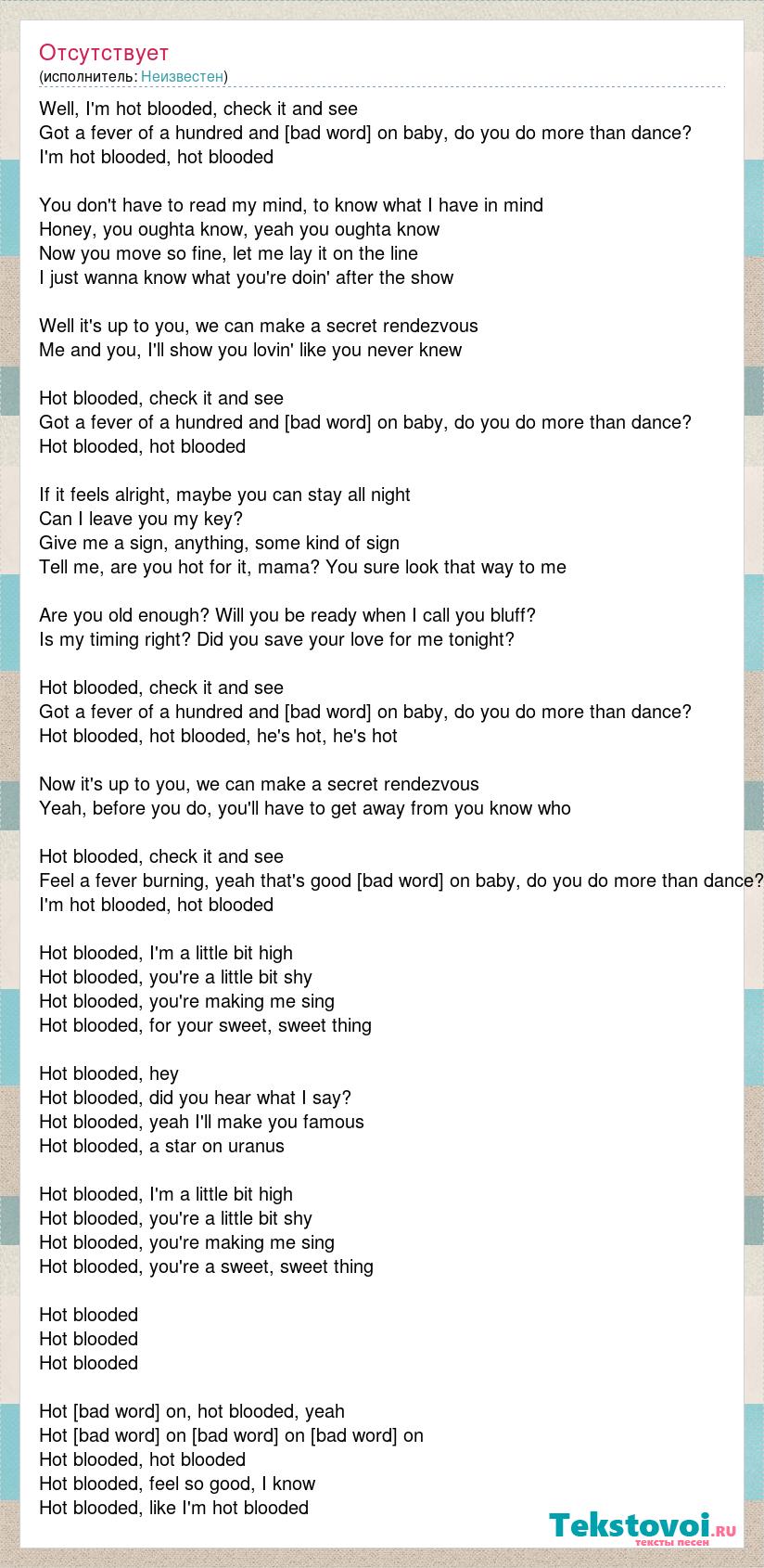 Well, I'm hot blooded, check it and see Got a fever of a hundred and [bad word] on baby, do you do more than dance? I'm hot blooded, hot blooded You don't have to read my mind, to know what I have in mind Honey, you oughta know, yeah you oughta know Now you move so fine, let me lay it on the line I just wanna know what you're doin' after the show Well it's up to you, we can make a secret rendezvous Me and you, I'll show you lovin' like you never knew Hot blooded, check it and see Got a fever of a hundred and [bad word] on baby, do you do more than dance? Hot blooded, hot blooded If it feels alright, maybe you can stay all night Can I leave you my key? Give me a sign, anything, some kind of sign Tell me, are you hot for it, mama? You sure look that way to me Are you old enough? Will you be ready when I call you bluff? Is my timing right? Did you save your love for me tonight? Hot blooded, check it and see Got a fever of a hundred and [bad word] on baby, do you do more than dance? Hot blooded, hot blooded, he's hot, he's hot Now it's up to you, we can make a secret rendezvous Yeah, before you do, you'll have to get away from you know who Hot blooded, check it and see Feel a fever burning, yeah that's good [bad word] on baby, do you do more than dance? I'm hot blooded, hot blooded Hot blooded, I'm a little bit high Hot blooded, you're a little bit shy Hot blooded, you're making me sing Hot blooded, for your sweet, sweet thing Hot blooded, hey Hot blooded, did you hear what I say? Hot blooded, yeah I'll make you famous Hot blooded, a star on uranus Hot blooded, I'm a little bit high Hot blooded, you're a little bit shy Hot blooded, you're making me sing Hot blooded, you're a sweet, sweet thing Hot blooded Hot blooded Hot blooded Hot [bad word] on, hot blooded, yeah Hot [bad word] on [bad word] on [bad word] on Hot blooded, hot blooded Hot blooded, feel so good, I know Hot blooded, like I'm hot blooded