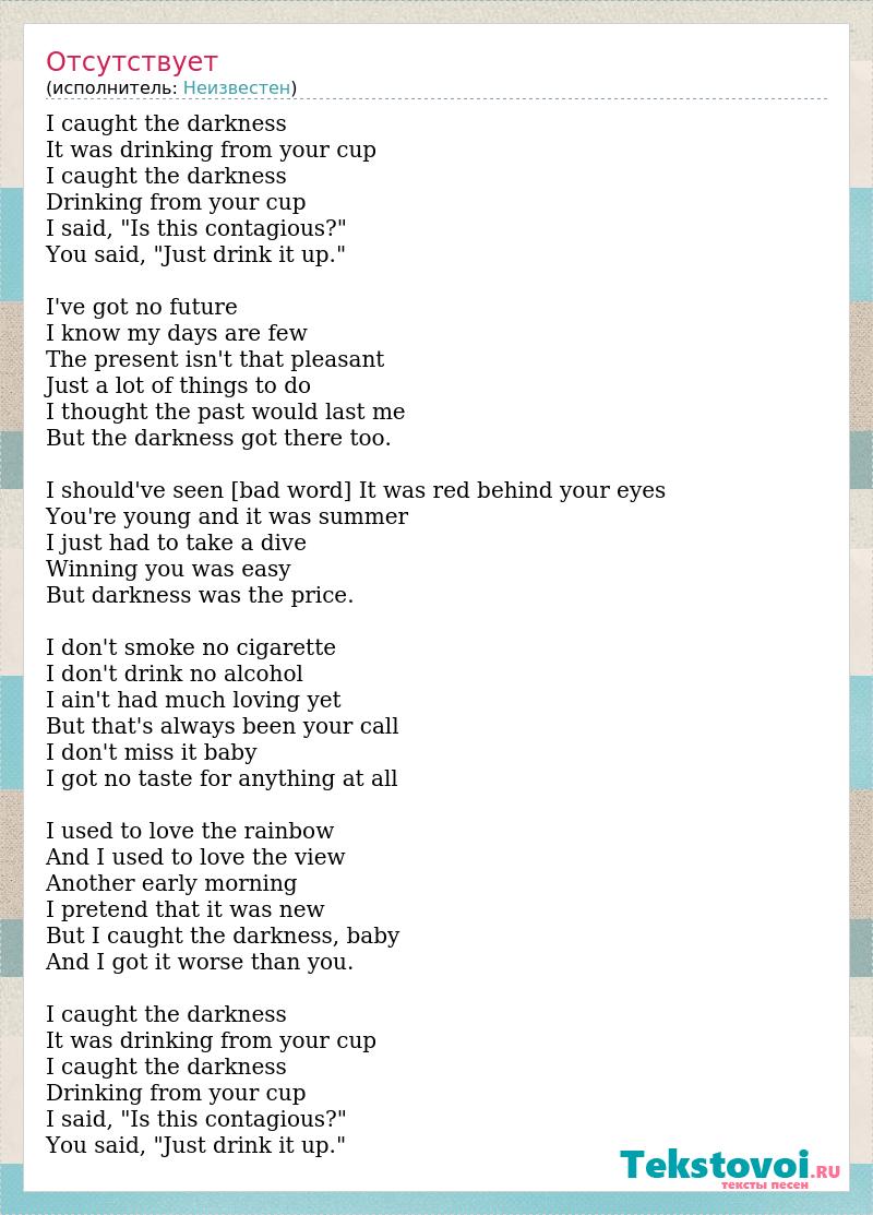 I caught the darkness It was drinking from your cup I caught the darkness Drinking from your cup I said, "Is this contagious?" You said, "Just drink it up." I've got no future I know my days are few The present isn't that pleasant Just a lot of things to do I thought the past would last me But the darkness got there too. I should've seen [bad word] It was red behind your eyes You're young and it was summer I just had to take a dive Winning you was easy But darkness was the price. I don't smoke no cigarette I don't drink no alcohol I ain't had much loving yet But that's always been your call I don't miss it baby I got no taste for anything at all I used to love the rainbow And I used to love the view Another early morning I pretend that it was new But I caught the darkness, baby And I got it worse than you. I caught the darkness It was drinking from your cup I caught the darkness Drinking from your cup I said, "Is this contagious?" You said, "Just drink it up."