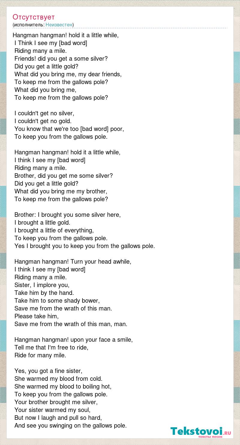 Hangman hangman! hold it a little while, I Think I see my [bad word] Riding many a mile. Friends! did you get a some silver? Did you get a little gold? What did you bring me, my dear friends, To keep me from the gallows pole? What did you bring me, To keep me from the gallows pole? I couldn't get no silver, I couldn't get no gold. You know that we're too [bad word] poor, To keep you from the gallows pole. Hangman hangman! hold it a little while, I think I see my [bad word] Riding many a mile. Brother, did you get me some silver? Did you get a little gold? What did you bring me my brother, To keep me from the gallows pole? Brother: I brought you some silver here, I brought a little gold. I brought a little of everything, To keep you from the gallows pole. Yes I brought you to keep you from the gallows pole. Hangman hangman! Turn your head awhile, I think I see my [bad word] Riding many a mile. Sister, I implore you, Take him by the hand. Take him to some shady bower, Save me from the wrath of this man. Please take him, Save me from the wrath of this man, man. Hangman hangman! upon your face a smile, Tell me that I'm free to ride, Ride for many mile. Yes, you got a fine sister, She warmed my blood from cold. She warmed my blood to boiling hot, To keep you from the gallows pole. Your brother brought me silver, Your sister warmed my soul, But now I laugh and pull so hard, And see you swinging on the gallows pole.