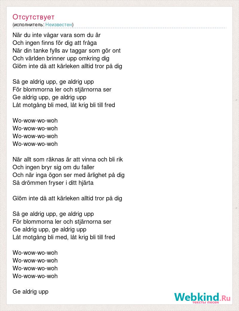 När du inte vågar vara som du är Och ingen finns för dig att fråga När din tanke fylls av taggar som gör ont Och världen brinner upp omkring dig Glöm inte då att kärleken alltid tror på dig Så ge aldrig upp, ge aldrig upp För blommorna ler och stjärnorna ser Ge aldrig upp, ge aldrig upp Låt motgång bli med, låt krig bli till fred Wo-wow-wo-woh Wo-wow-wo-woh Wo-wow-wo-woh Wo-wow-wo-woh När allt som räknas är att vinna och bli rik Och ingen bryr sig om du faller Och när inga ögon ser med ärlighet på dig Så drömmen fryser i ditt hjärta Glöm inte då att kärleken alltid tror på dig Så ge aldrig upp, ge aldrig upp För blommorna ler och stjärnorna ser Ge aldrig upp, ge aldrig upp Låt motgång bli med, låt krig bli till fred Wo-wow-wo-woh Wo-wow-wo-woh Wo-wow-wo-woh Wo-wow-wo-woh Ge aldrig upp
