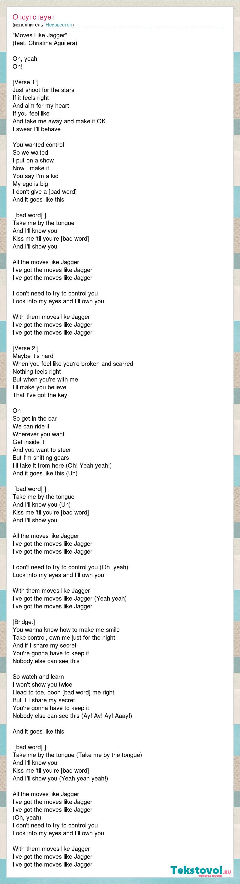 "Moves Like Jagger" (feat. Christina Aguilera) Oh, yeah Oh! [Verse 1:] Just shoot for the stars If it feels right And aim for my heart If you feel like And take me away and make it OK I swear I'll behave You wanted control So we waited I put on a show Now I make it You say I'm a kid My ego is big I don't give a [bad word] And it goes like this [bad word] ] Take me by the tongue And I'll know you Kiss me 'til you're [bad word] And I'll show you All the moves like Jagger I've got the moves like Jagger I've got the moves like Jagger I don't need to try to control you Look into my eyes and I'll own you With them moves like Jagger I've got the moves like Jagger I've got the moves like Jagger [Verse 2:] Maybe it's hard When you feel like you're broken and scarred Nothing feels right But when you're with me I'll make you believe That I've got the key Oh So get in the car We can ride it Wherever you want Get inside it And you want to steer But I'm shifting gears I'll take it from here (Oh! Yeah yeah!) And it goes like this (Uh) [bad word] ] Take me by the tongue And I'll know you (Uh) Kiss me 'til you're [bad word] And I'll show you All the moves like Jagger I've got the moves like Jagger I've got the moves like Jagger I don't need to try to control you (Oh, yeah) Look into my eyes and I'll own you With them moves like Jagger I've got the moves like Jagger (Yeah yeah) I've got the moves like Jagger [Bridge:] You wanna know how to make me smile Take control, own me just for the night And if I share my secret You're gonna have to keep it Nobody else can see this So watch and learn I won't show you twice Head to toe, oooh [bad word] me right But if I share my secret You're gonna have to keep it Nobody else can see this (Ay! Ay! Ay! Aaay!) And it goes like this [bad word] ] Take me by the tongue (Take me by the tongue) And I'll know you Kiss me 'til you're [bad word] And I'll show you (Yeah yeah yeah!) All the moves like Jagger I've got the moves like Jagger I've got the moves like Jagger (Oh, yeah) I don't need to try to control you Look into my eyes and I'll own you With them moves like Jagger I've got the moves like Jagger I've got the moves like Jagger