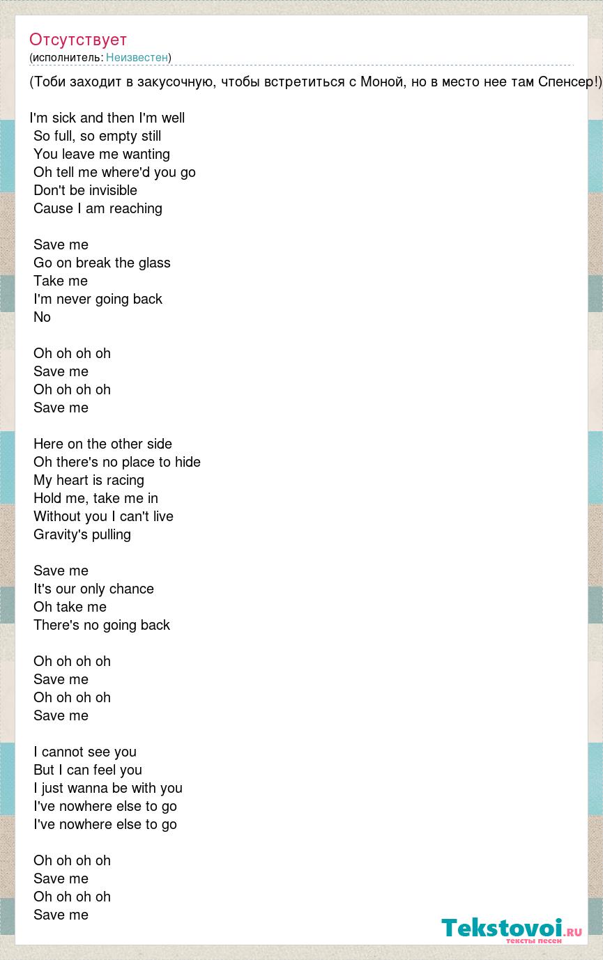(Тоби заходит в закусочную, чтобы встретиться с Моной, но в место нее там Спенсер!) I'm sick and then I'm well So full, so empty still You leave me wanting Oh tell me where'd you go Don't be invisible Cause I am reaching Save me Go on break the glass Take me I'm never going back No Oh oh oh oh Save me Oh oh oh oh Save me Here on the other side Oh there's no place to hide My heart is racing Hold me, take me in Without you I can't live Gravity's pulling Save me It's our only chance Oh take me There's no going back Oh oh oh oh Save me Oh oh oh oh Save me I cannot see you But I can feel you I just wanna be with you I've nowhere else to go I've nowhere else to go Oh oh oh oh Save me Oh oh oh oh Save me