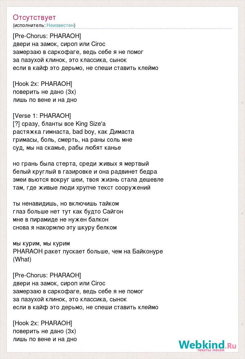 [bad word] PHARAOH] двери на замок, сироп или Ciroc замерзаю в саркофаге, ведь себе я не помог за пазухой клинок, это классика, сынок если в кайф это дерьмо, не спеши ставить клеймо [Hook 2x: PHARAOH] поверить не дано (3x) лишь по вене и на дно [Verse 1: PHARAOH] [?] сразу, бланты все King Size'а растяжка гимнаста, bad boy, как Димаста гримасы, боль, смерть, на раны соль мне суд, мы на скамье, рабы любят канье но грань была стерта, среди живых я мертвый белый круглый в газировке и она радвинет бедра змеи вьются вокруг шеи, твоя жизнь стала дешевле там, где живые люди хрупче текст сооружений ты ненавидишь, но включишь тайком глаз больше нет тут как будто Сайгон мне в пирамиде не нужен балкон снова я накормлю эту шкуру белком мы курим, мы курим PHARAOH ракет пускает больше, чем на Байконуре (What) [bad word] PHARAOH] двери на замок, сироп или Ciroc замерзаю в саркофаге, ведь себе я не помог за пазухой клинок, это классика, сынок если в кайф это дерьмо, не спеши ставить клеймо [Hook 2x: PHARAOH] поверить не дано (3x) лишь по вене и на дно