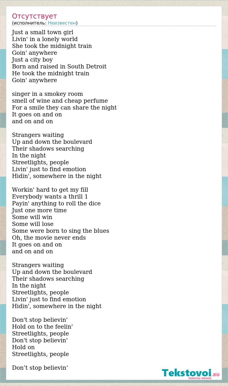 Just a small town girl Livin' in a lonely world She took the midnight train Goin' anywhere Just a city boy Born and raised in South Detroit He took the midnight train Goin' anywhere singer in a smokey room smell of wine and cheap perfume For a smile they can share the night It goes on and on and on and on Strangers waiting Up and down the boulevard Their shadows searching In the night Streetlights, people Livin' just to find emotion Hidin', somewhere in the night Workin' hard to get my fill Everybody wants a thrill 1 Payin' anything to roll the dice Just one more time Some will win Some will lose Some were born to sing the blues Oh, the movie never ends It goes on and on and on and on Strangers waiting Up and down the boulevard Their shadows searching In the night Streetlights, people Livin' just to find emotion Hidin', somewhere in the night Don't stop believin' Hold on to the feelin' Streetlights, people Don't stop believin' Hold on Streetlights, people Don’t stop believin’
